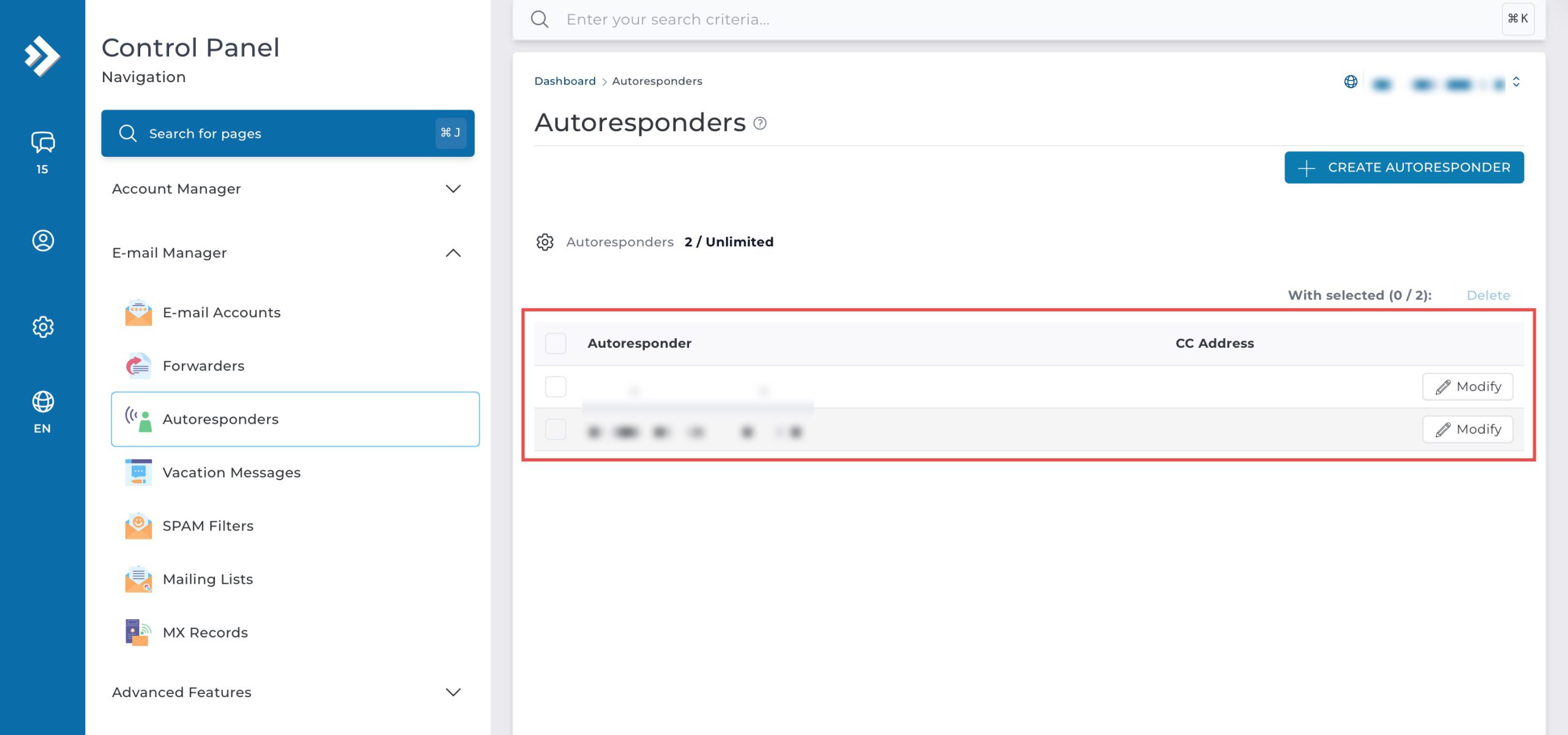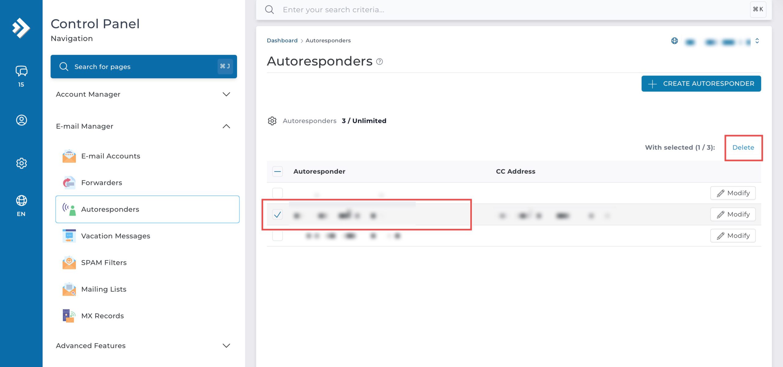 Deleting autoresponders through DirectAdmin’s Autoresponders interface is a simple process that removes outdated automated email responses. Eliminating unnecessary autoresponder configurations ensures your email accounts operate with current communication requirements, with the flexibility to delete single or multiple autoresponders as needed.