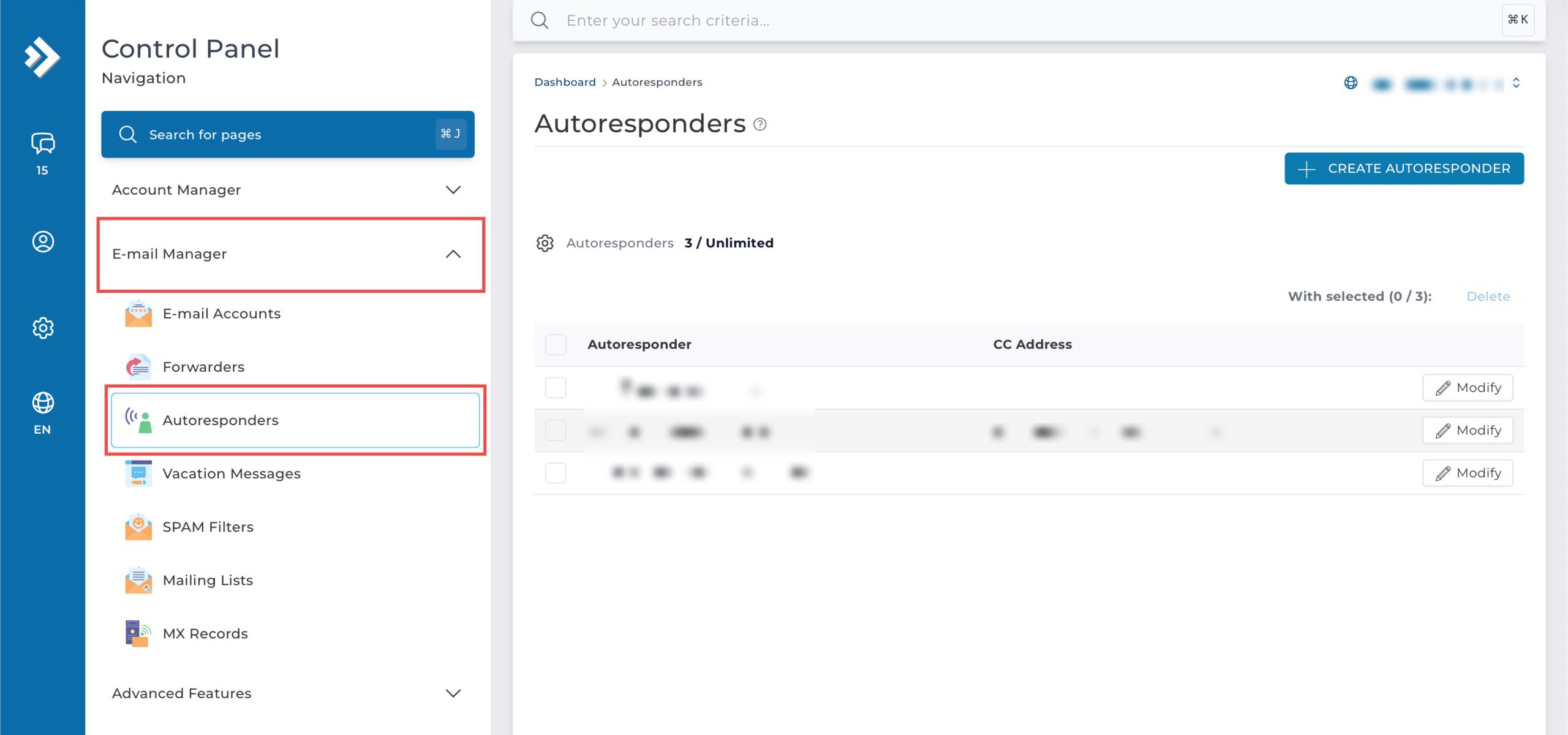 Go to the E-mail Manager section and click on Autoresponders. You will see a list of all your currently configured autoresponders.