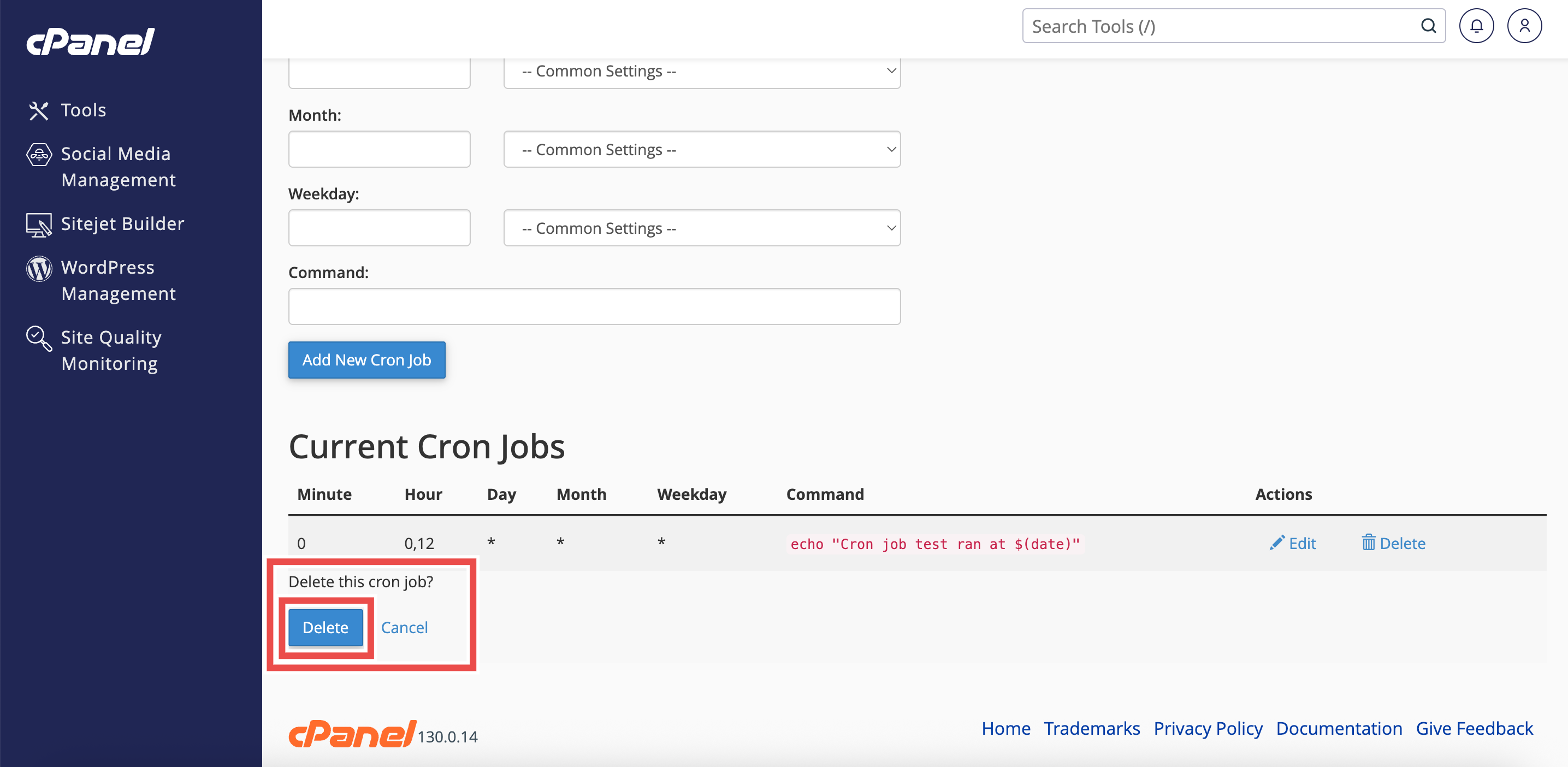 - A confirmation message will appear asking to confirm the deletion of the cron job.