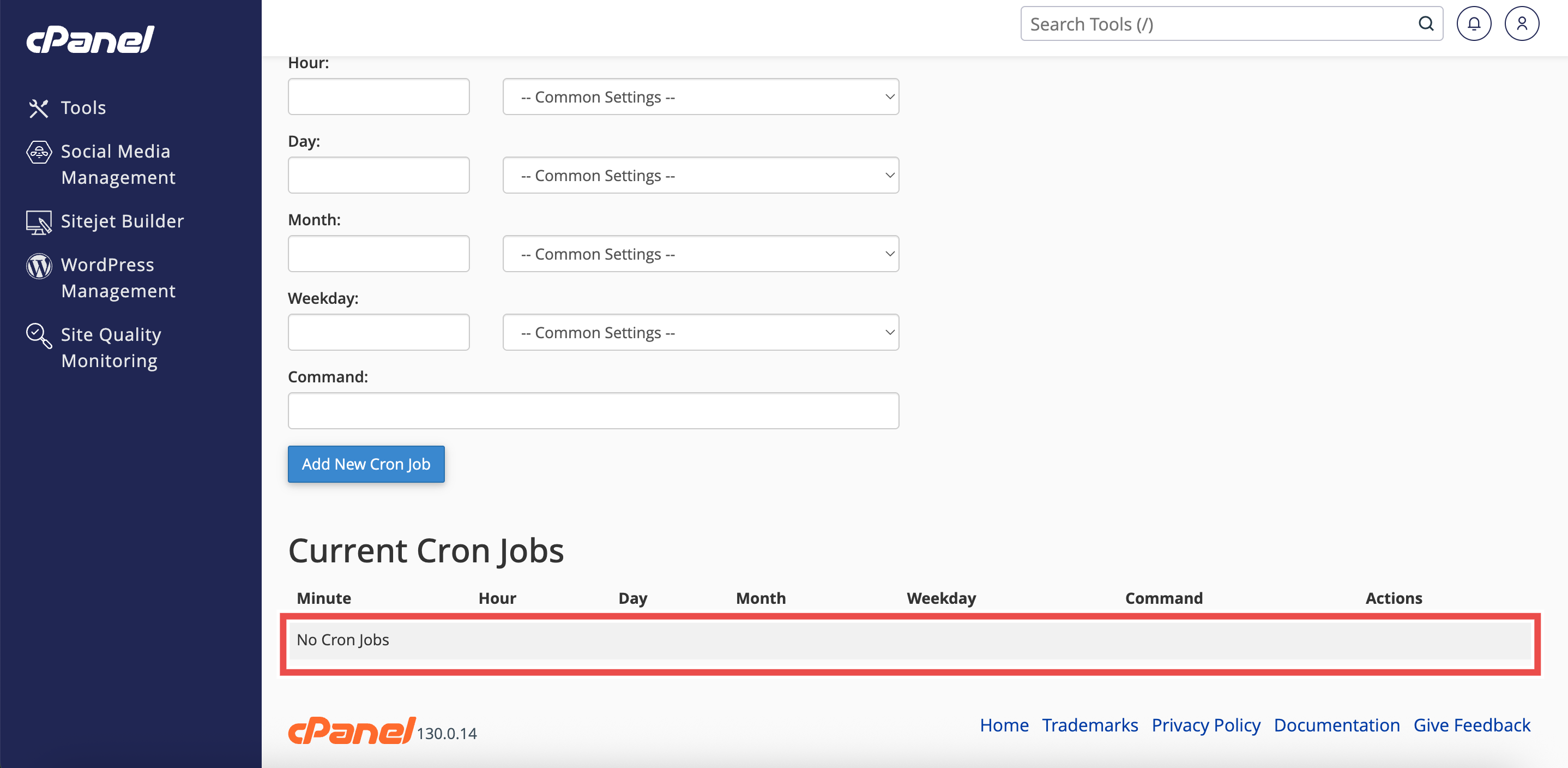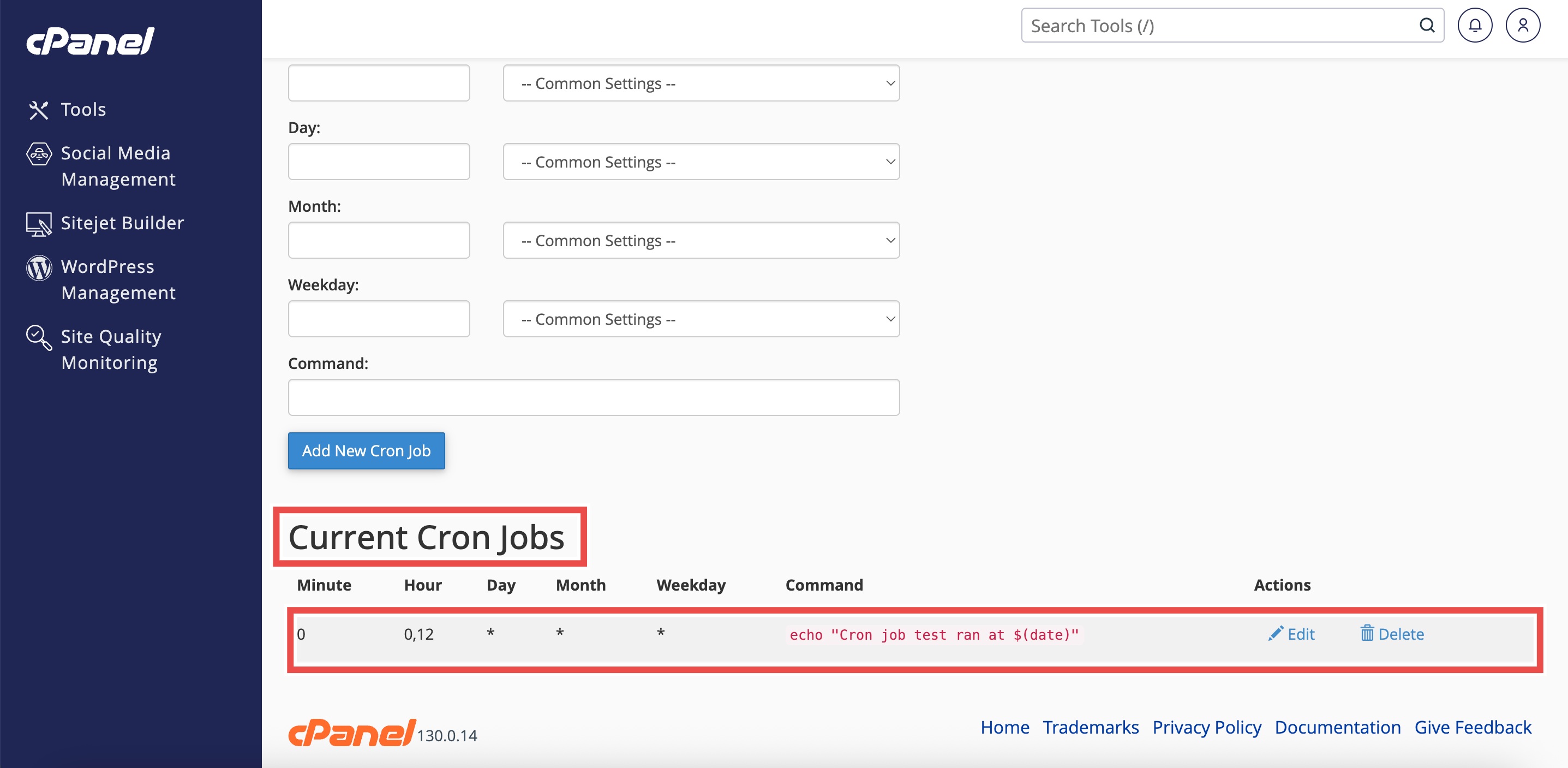 - Check the Current Cron Jobs table to ensure the deleted cron job no longer appears, confirming that it has been successfully removed.