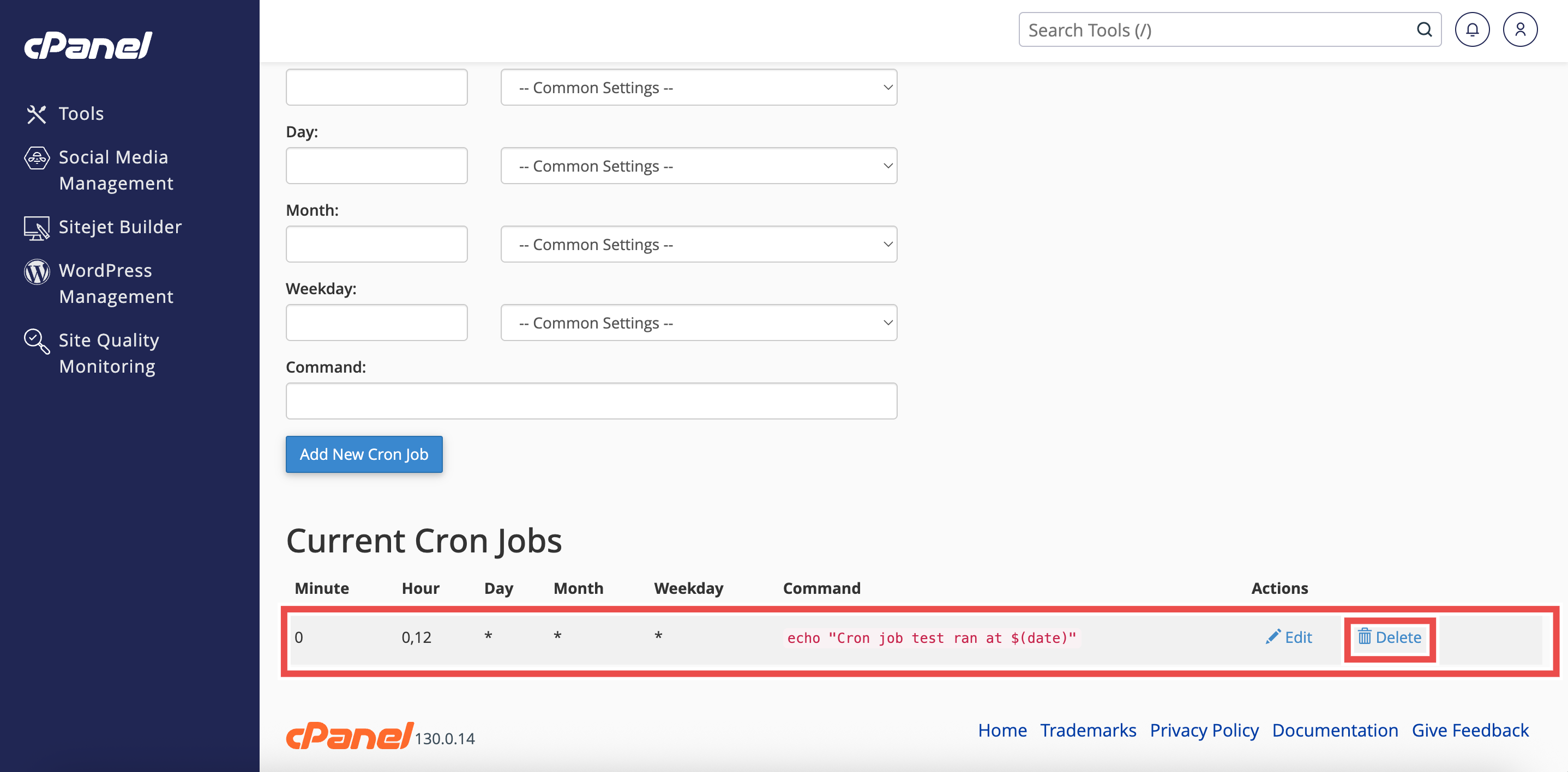 - Find the cron job to be deleted in the Current Cron Jobs table.