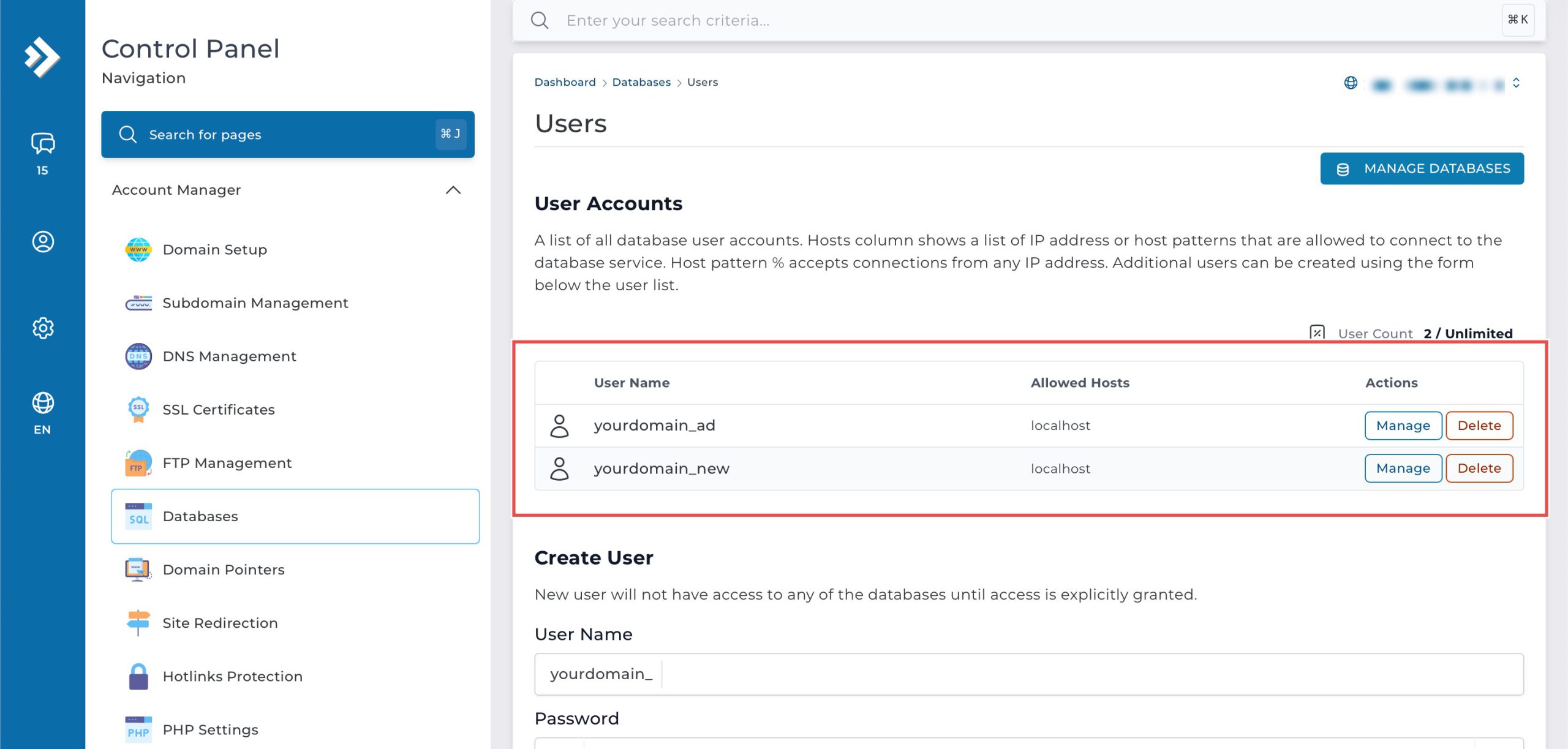 Go to the Account Manager section and click on Databases. You will see the list of databases available in the domain. On the top right, click Manage Users to see the list of existing database users.