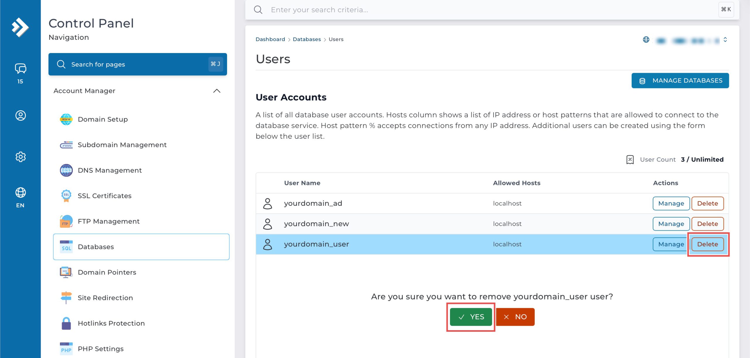 Deleting database users through DirectAdmin’s MySQL Management interface is a simple process that helps maintain secure database access control. Proper user management ensures that only authorized personnel have access to your databases, contributing to overall security and organized database administration.