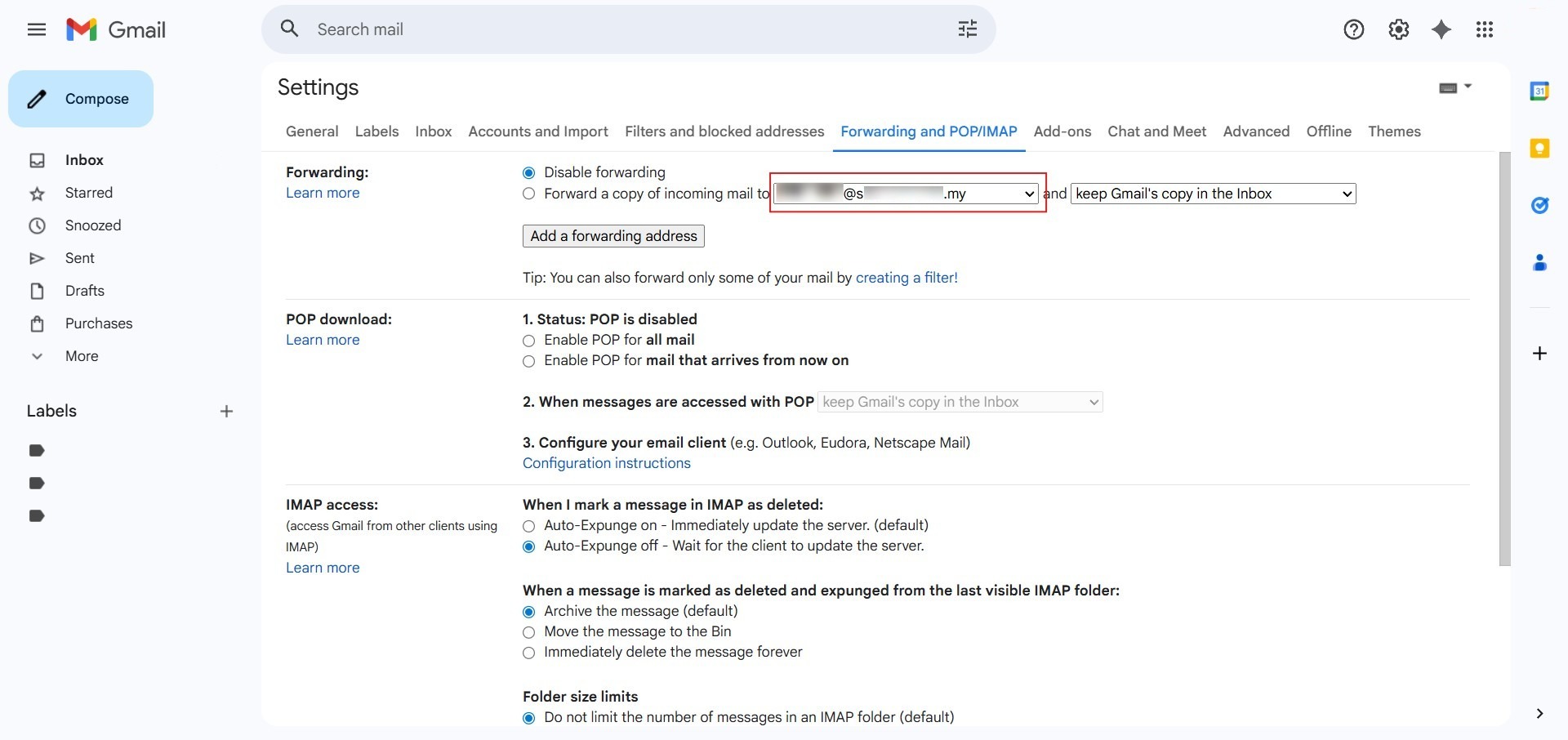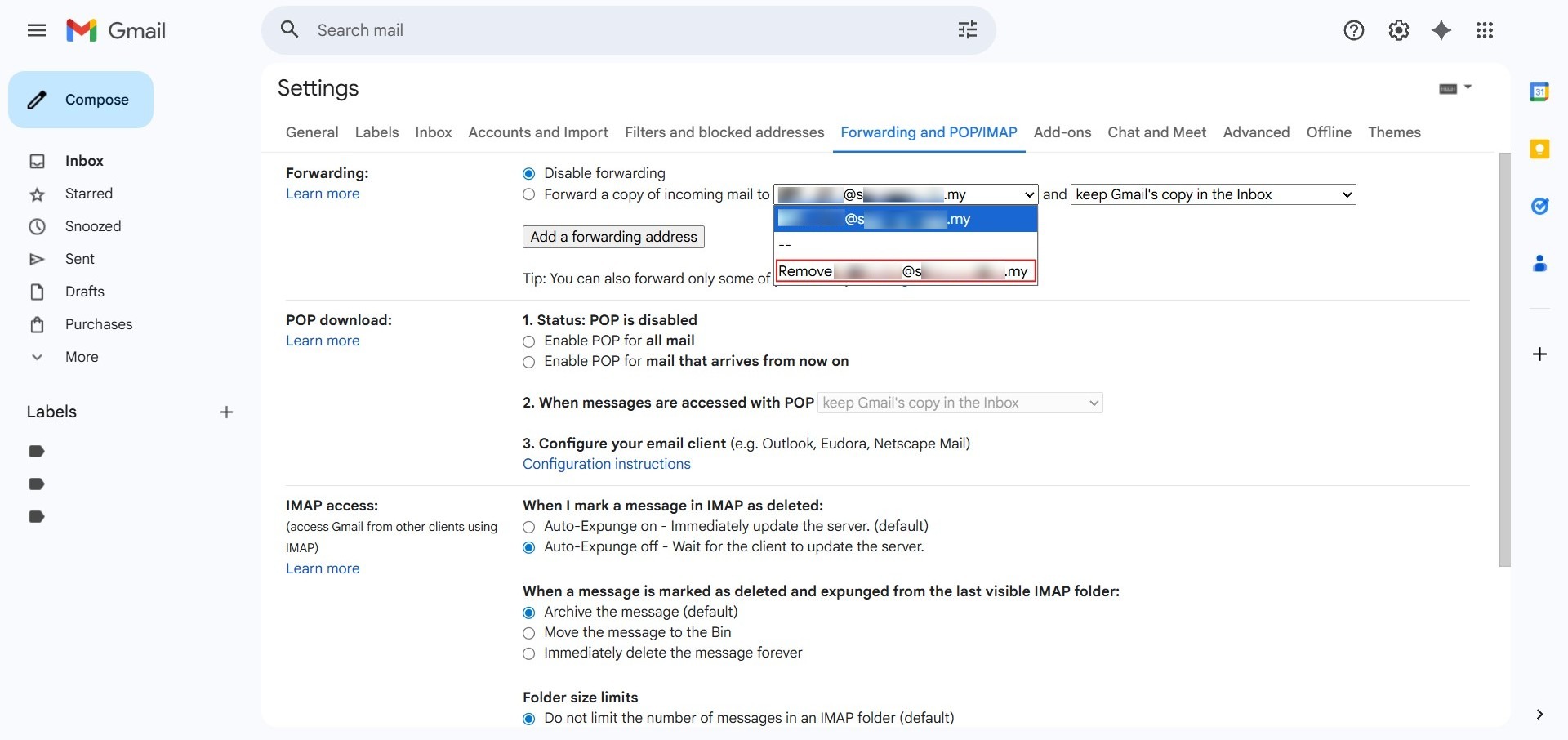 • Locate the Forwarding section and click on the email address dropdown box that lists your verified recipients.