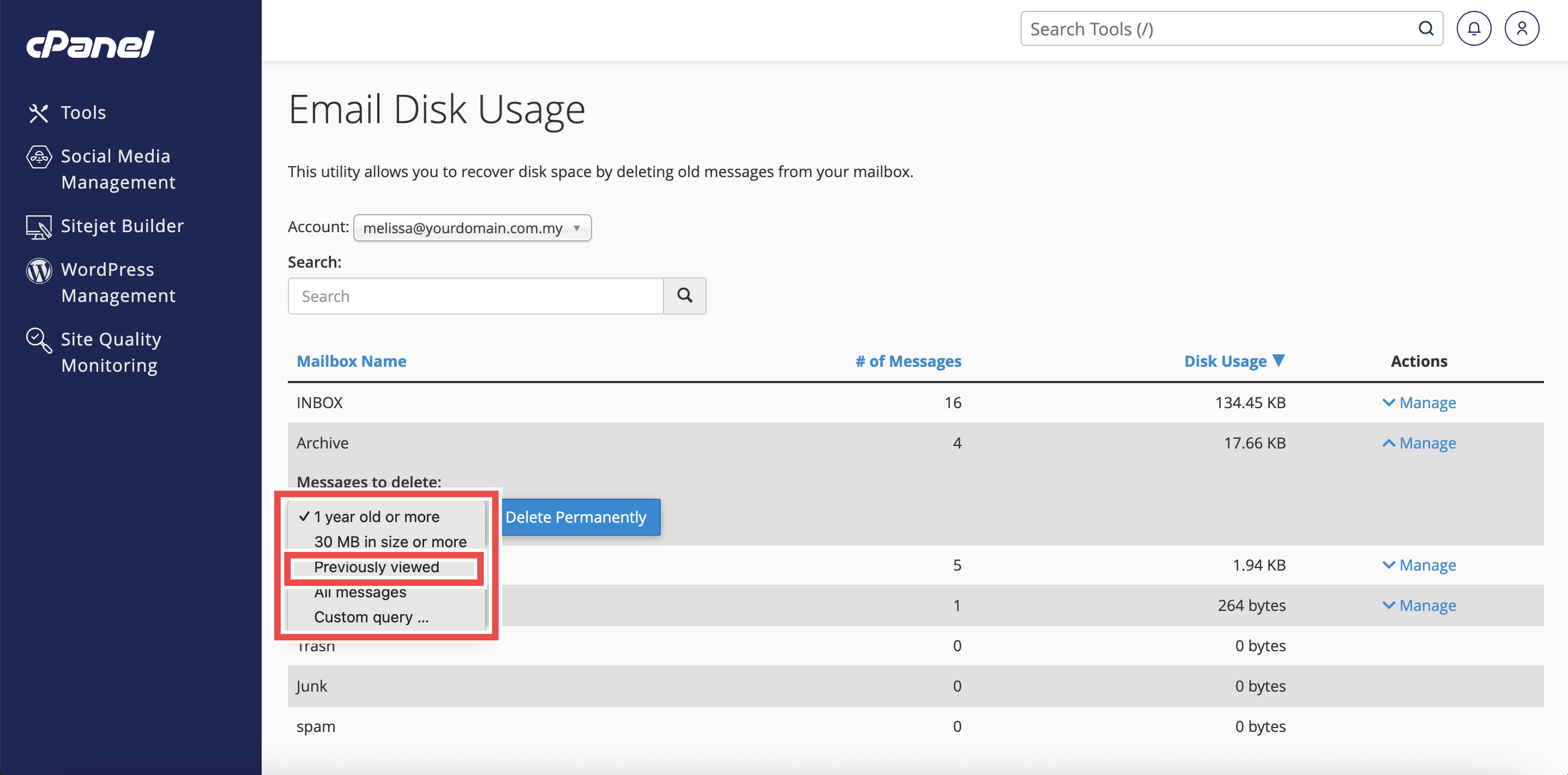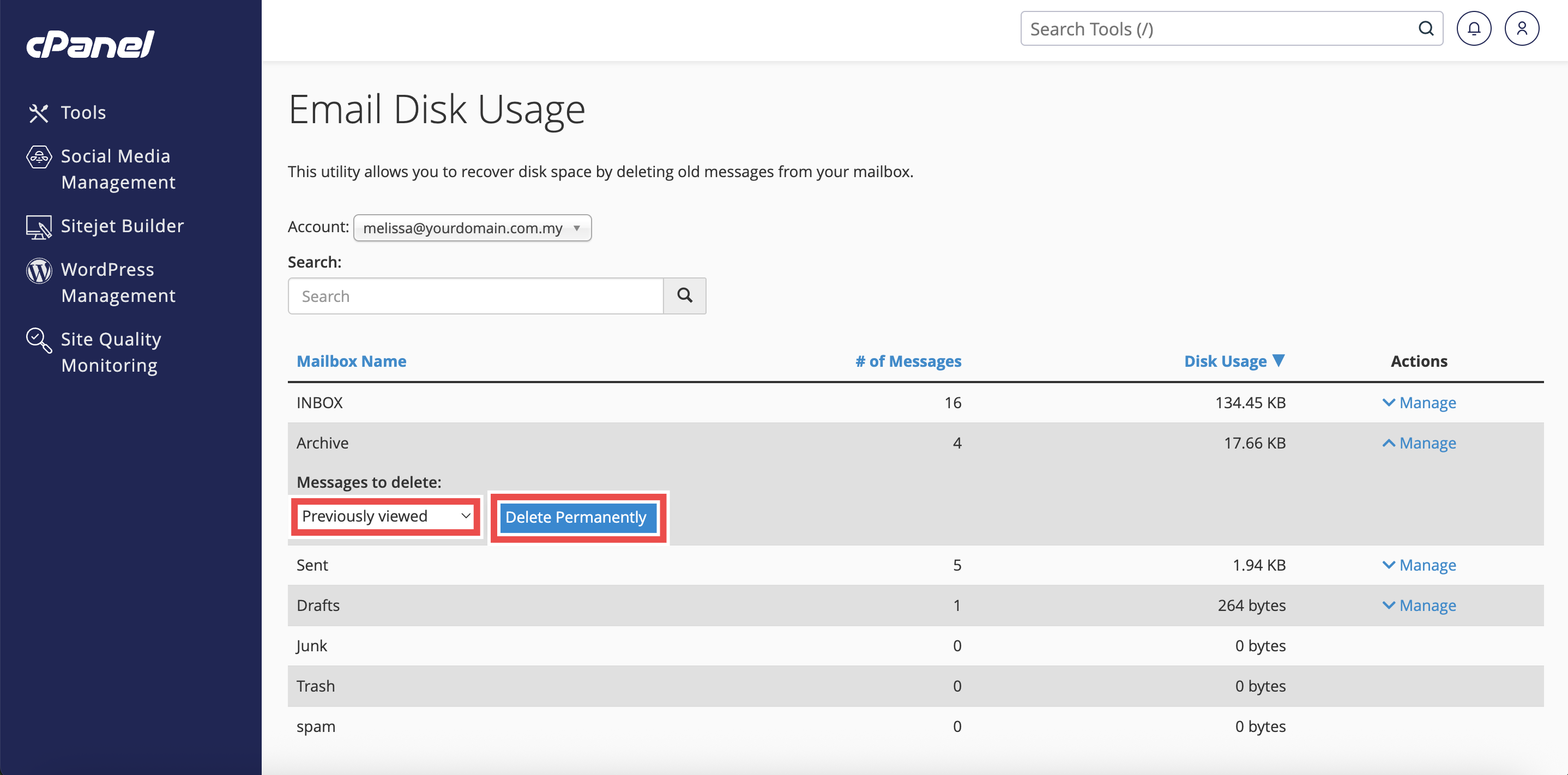 How to Delete Previously Viewed Emails from Archive Folder using Email Disk Usage in cPanel