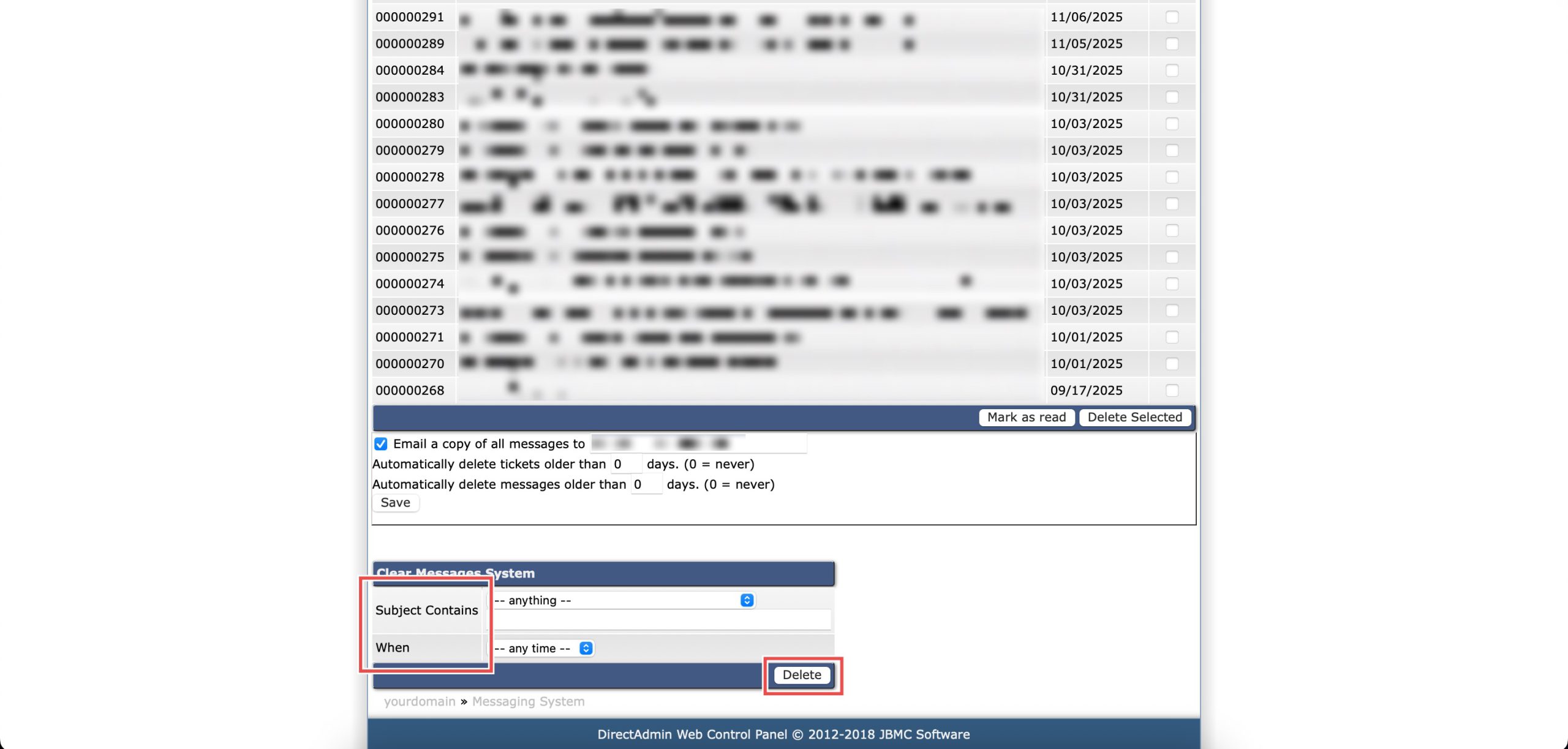 System messages in DirectAdmin provide important notifications about account activities and system events, but managing large volumes of messages efficiently requires advanced deletion options. Clearing messages by subject keywords or date ranges helps maintain an organized message inbox without manually selecting individual notifications. DirectAdmin’s Message System interface provides flexible filtering criteria for bulk message deletion based on content or timing. This guide explains how to clear system messages using criteria-based deletion in the Message System section in DirectAdmin, enabling you to efficiently manage notification history and maintain focus on relevant alerts.