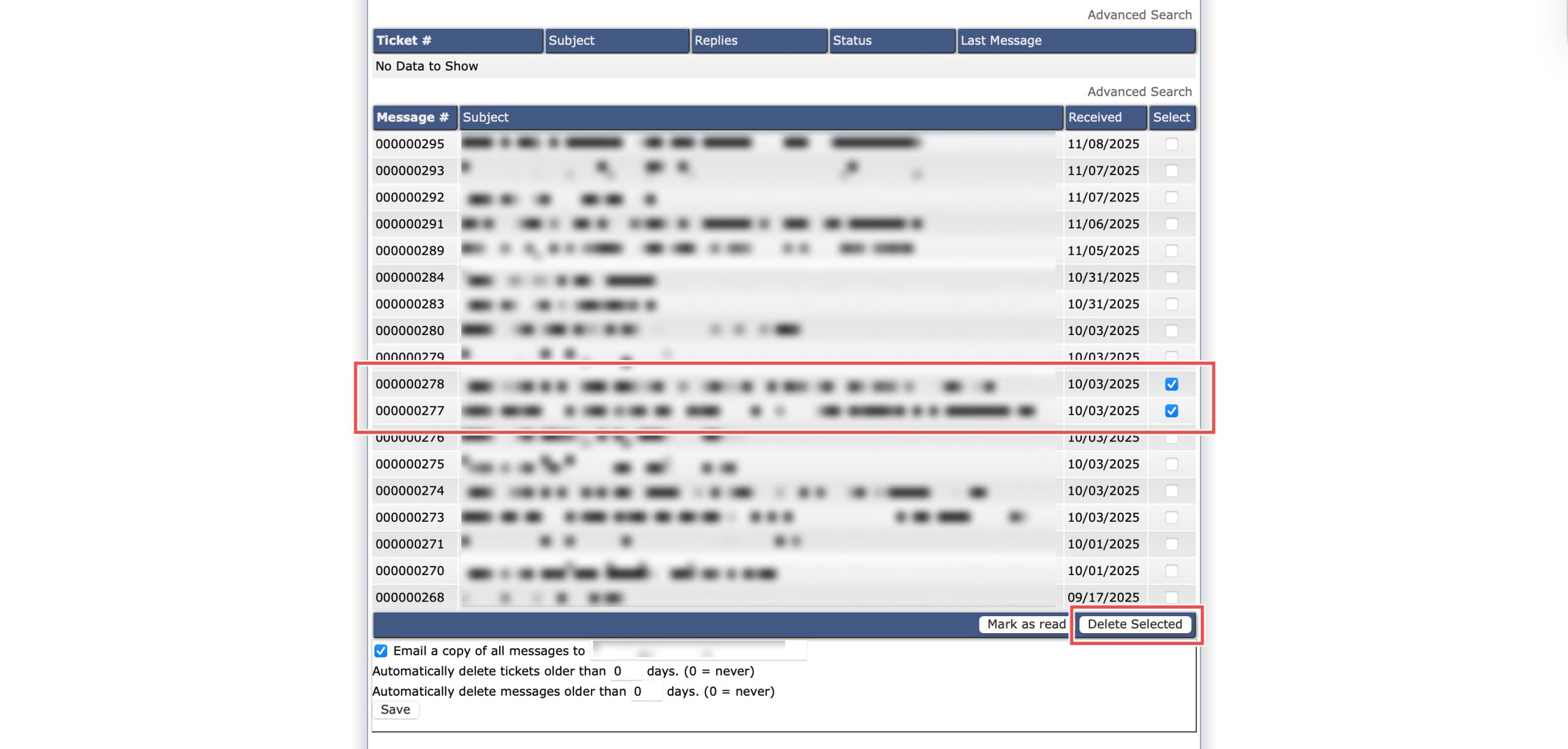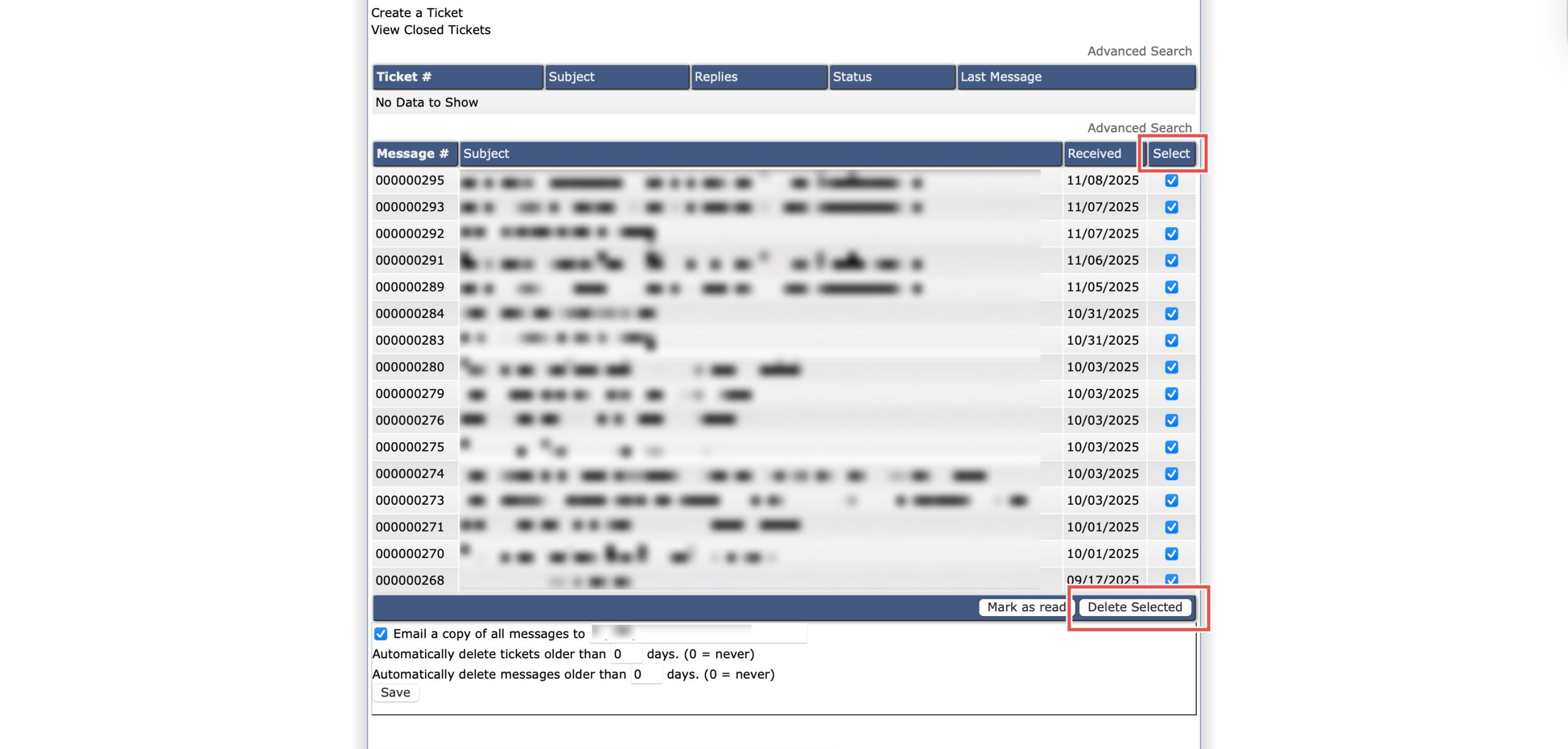 Click on Select at the right-most column, it will select all the displayed messages. Then, click Delete Selected.