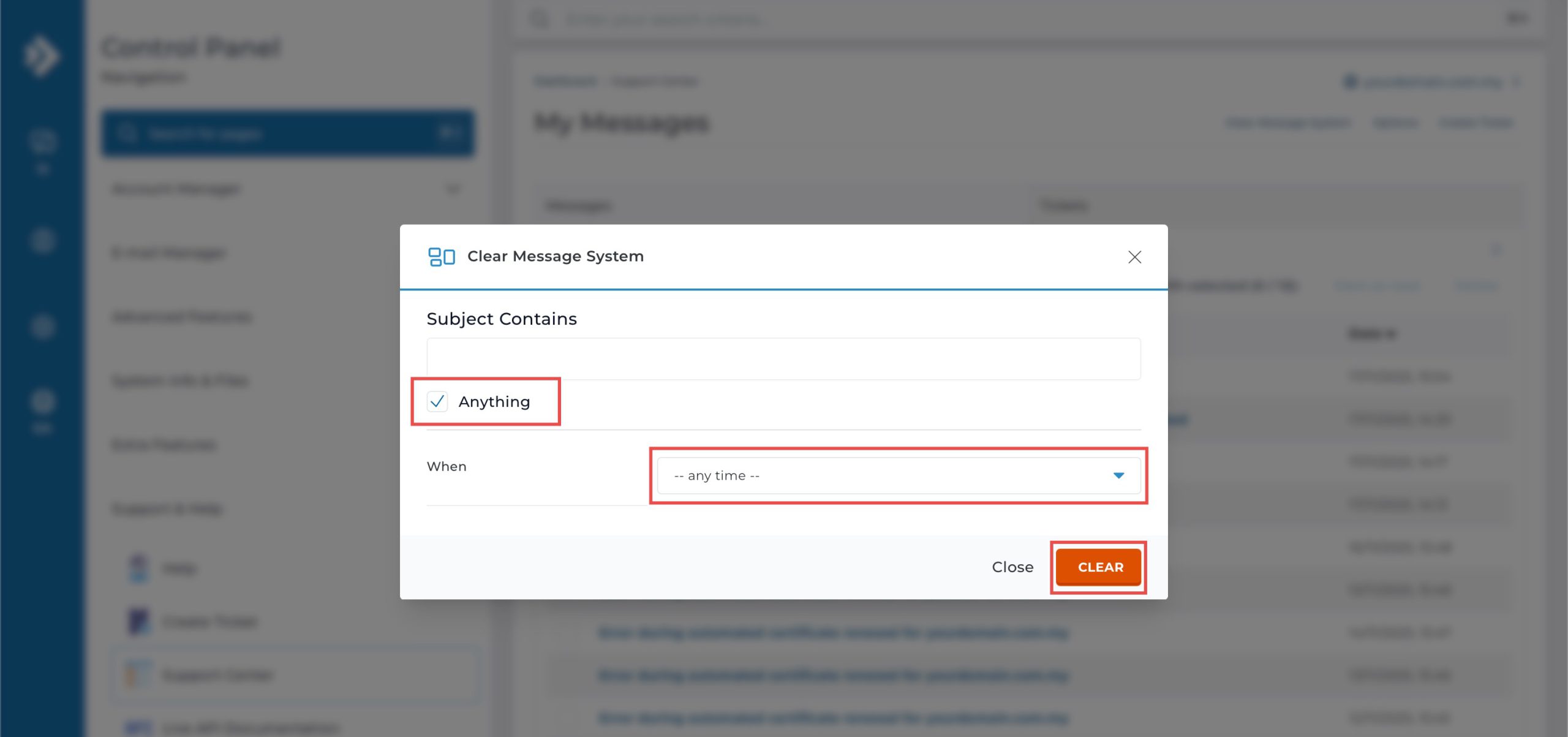 Click on Clear Message System at the top. On the pop-up window, check the Anything box and select — any time — for When. Then, click Clear.