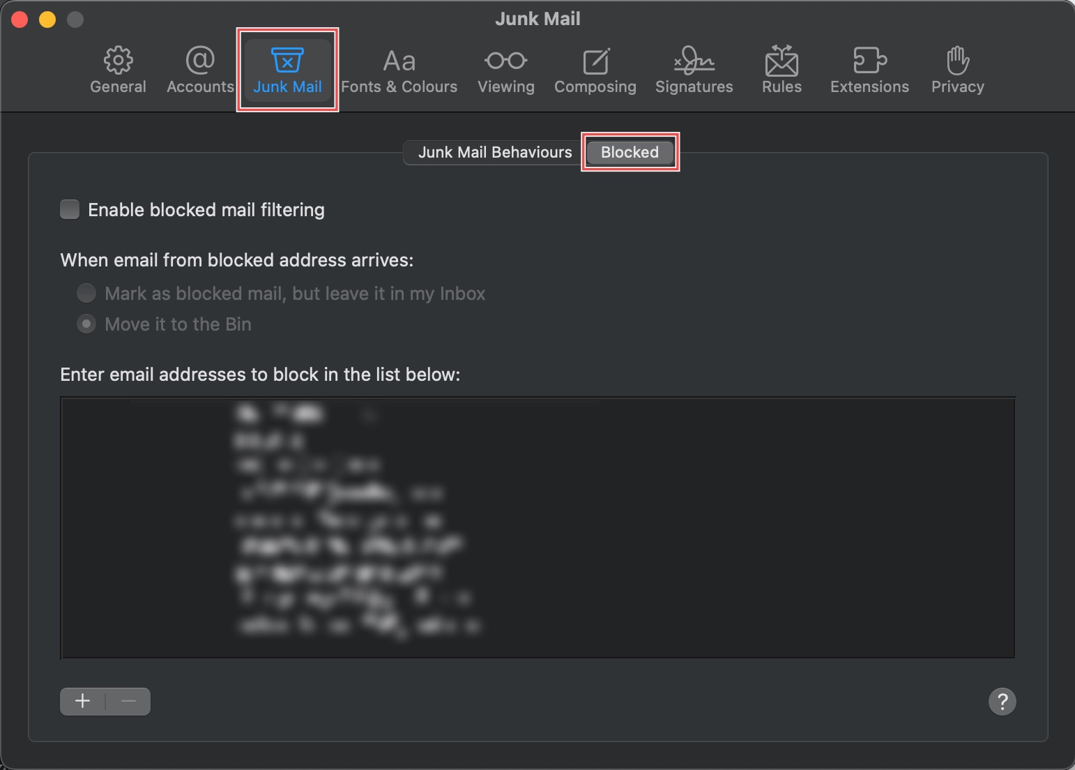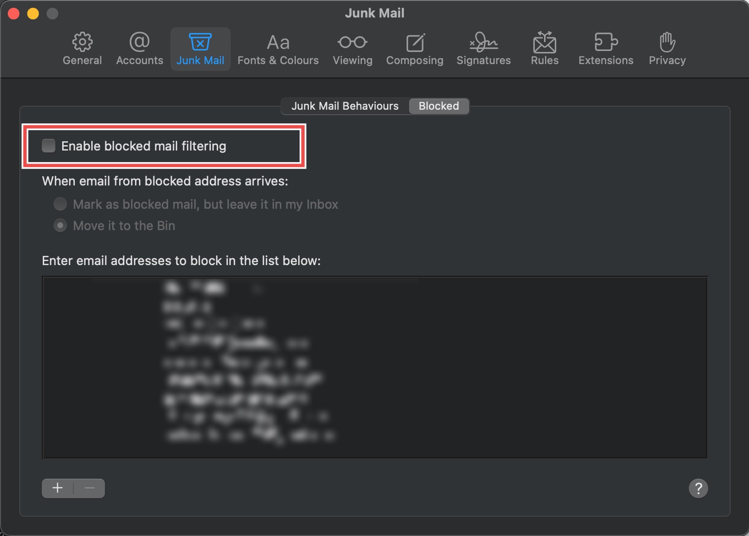Disabling blocked mail filtering through Apple Mail’s Blocked settings provides flexibility in managing emails from blocked senders. This option allows you to manually review messages from your block list or troubleshoot filtering issues while maintaining control over your email management workflow.