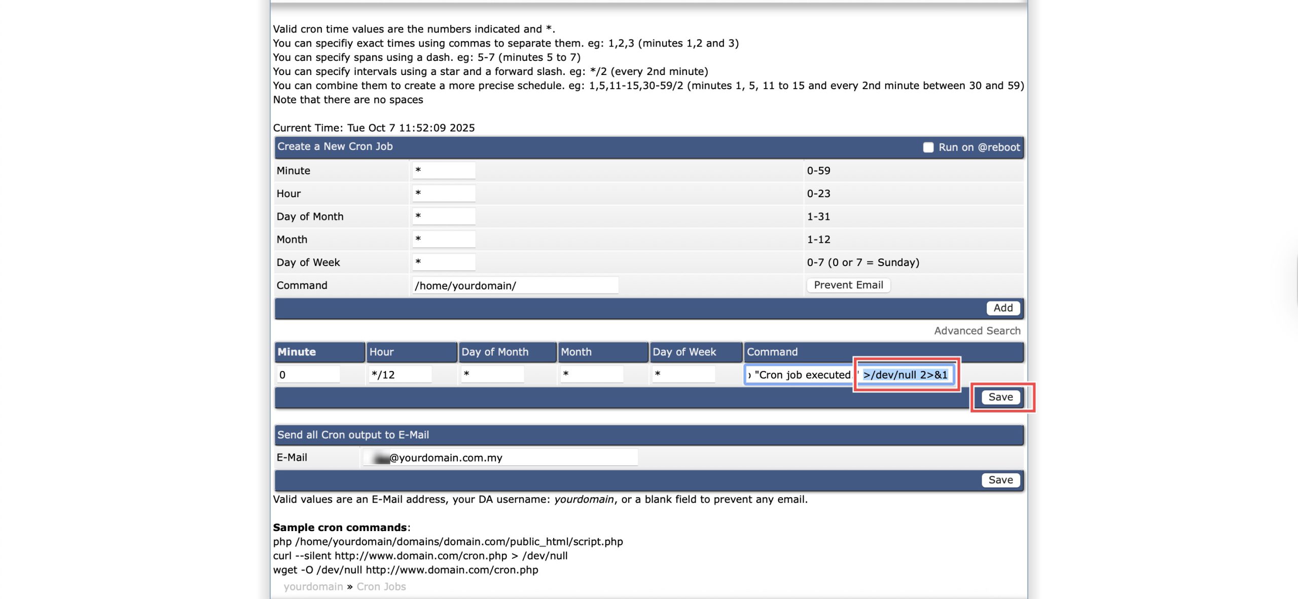 - In the command field, add >/dev/null 2>&1 at the end of the command.