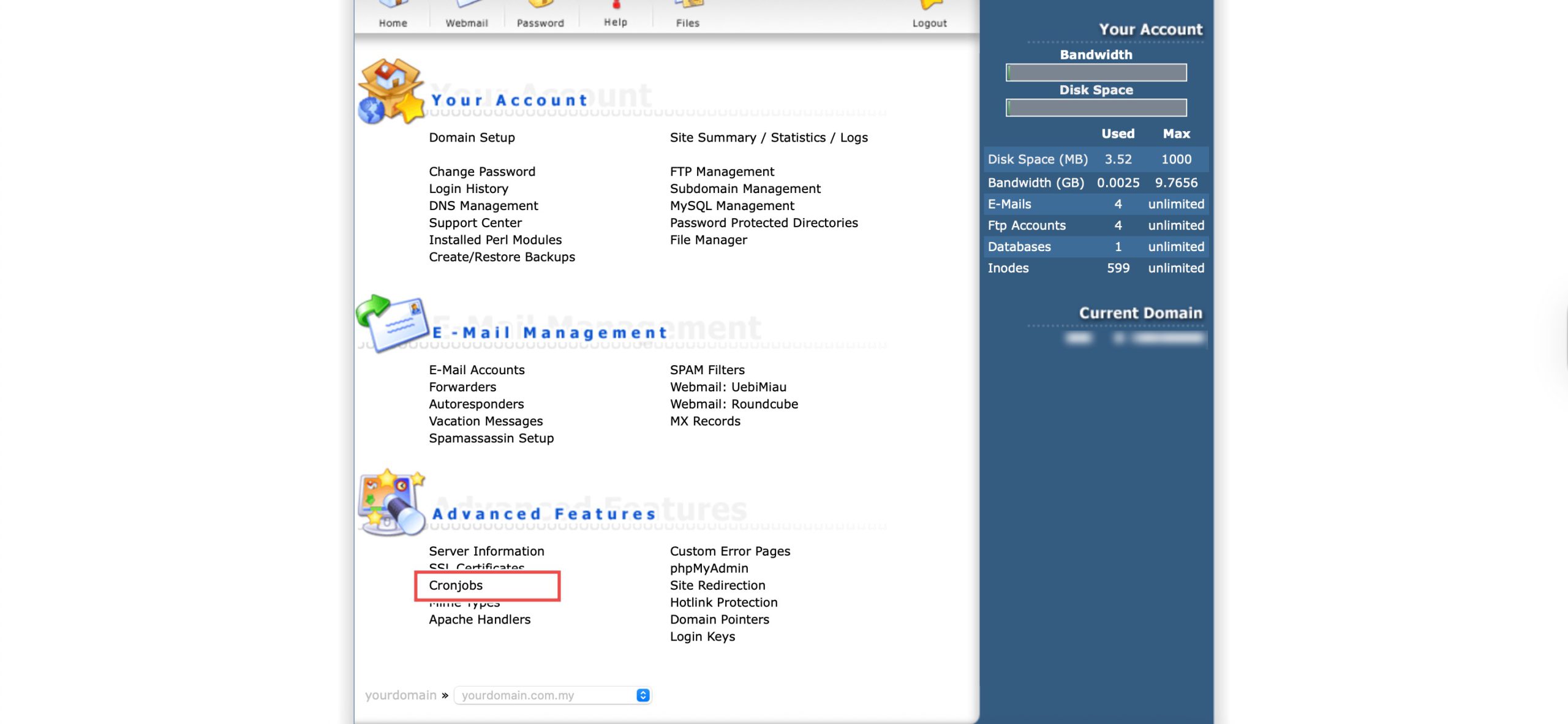 Go to the Advanced Features section and click on Cronjobs. You will see the list of currently set up cron jobs.