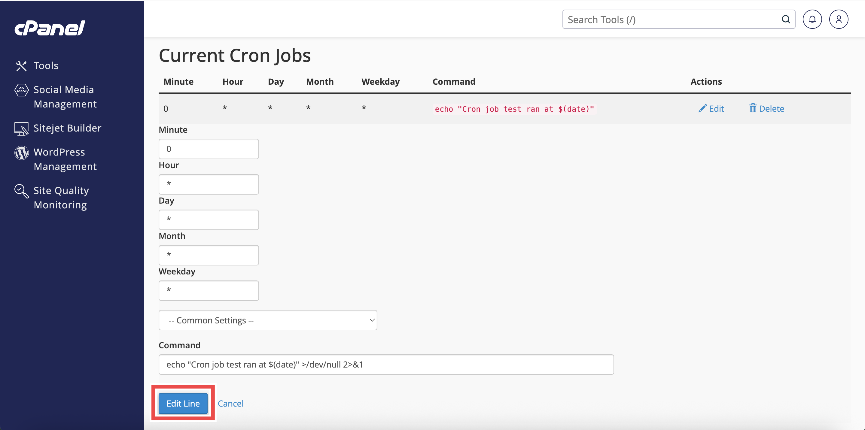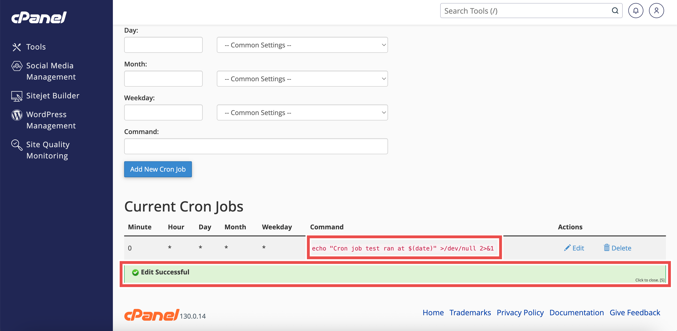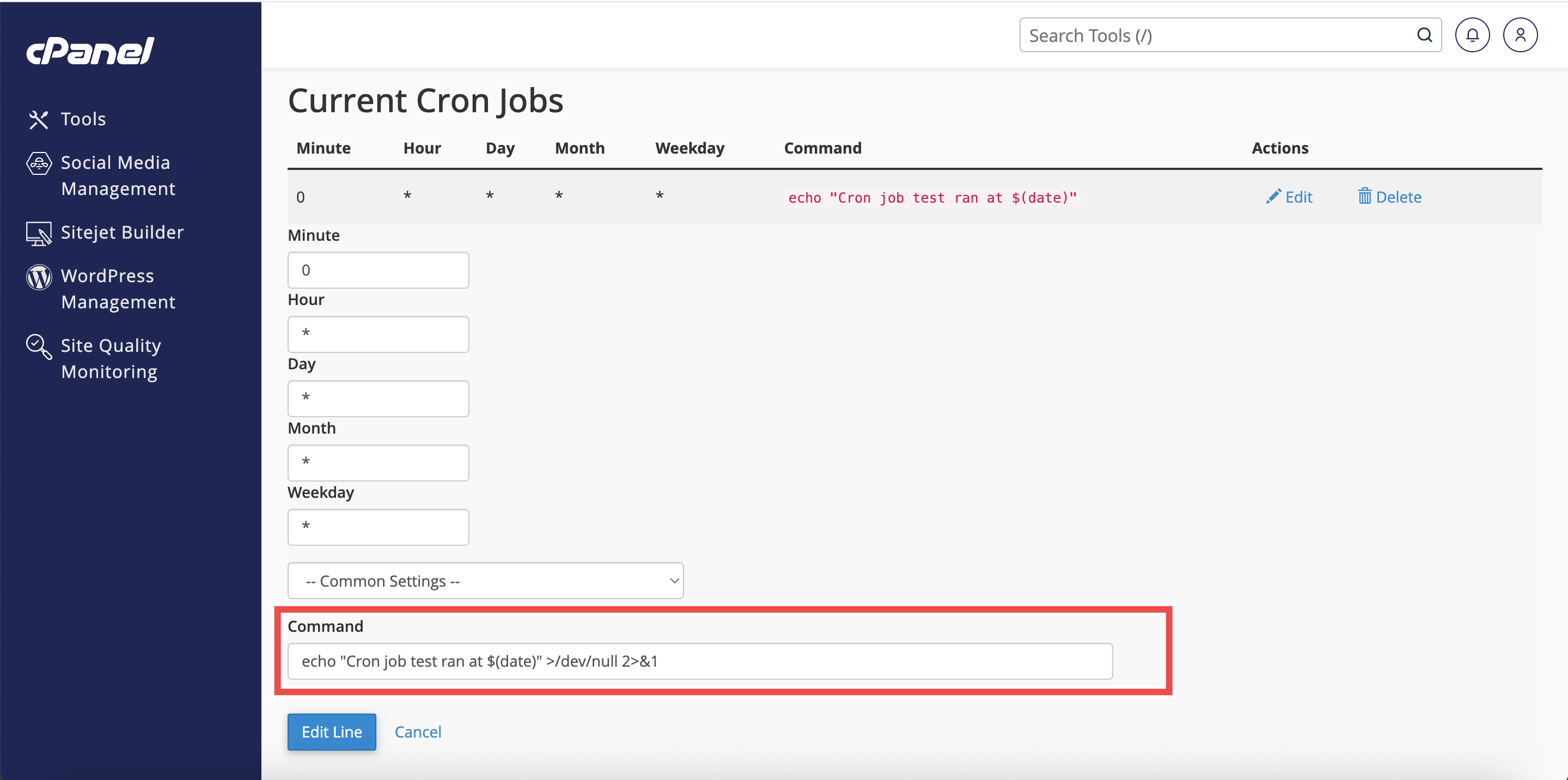 - Additionally, check the Current Cron Jobs table to ensure the command now includes /dev/null 2>&1, confirming that email notifications for this specific cron job have been disabled.