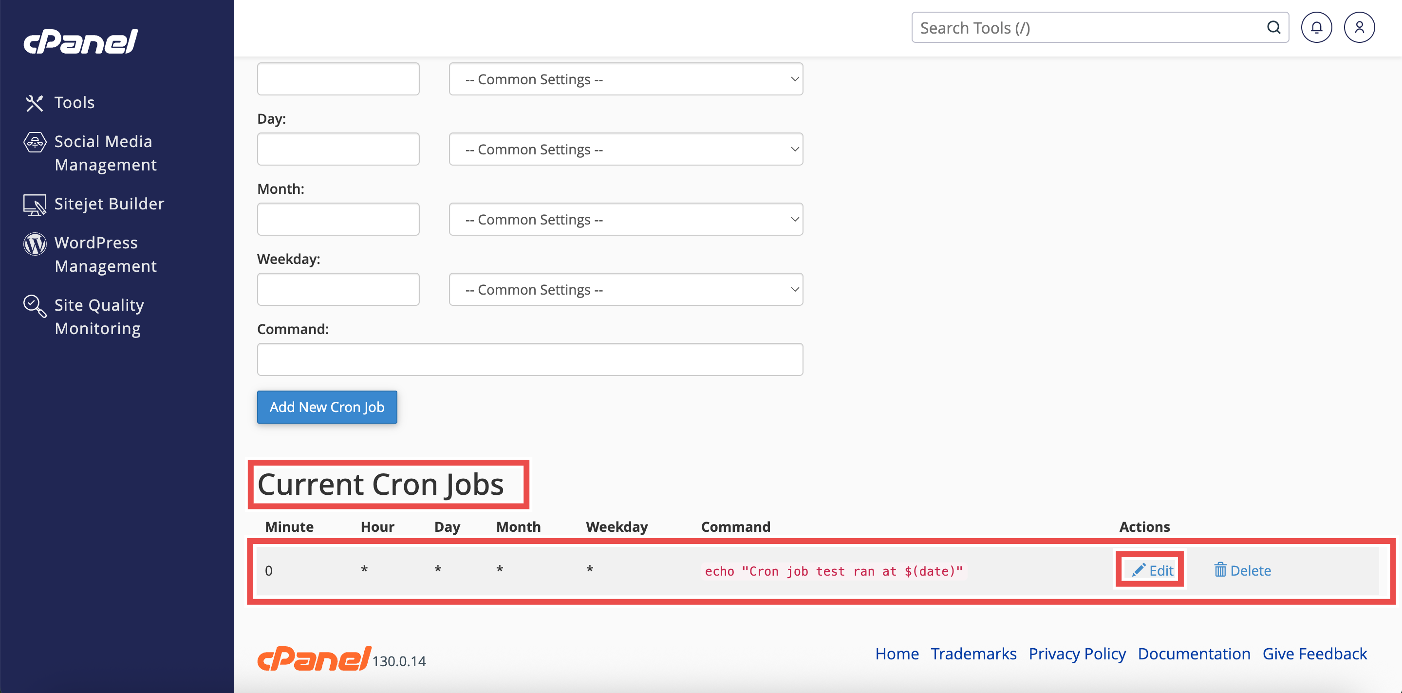 - In the Current Cron Jobs table, find the cron job for which you want to disable email notifications and click Edit.