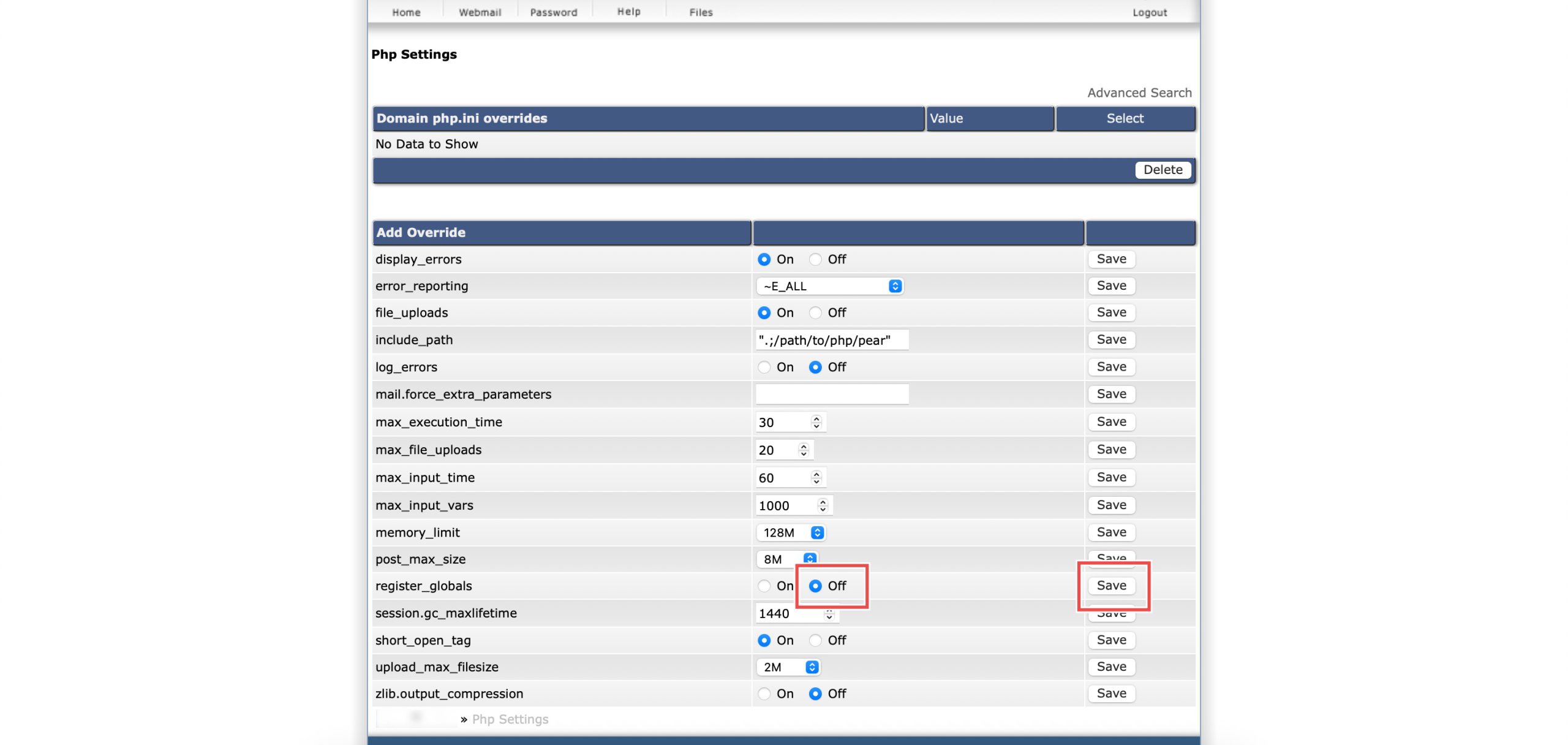Scroll down to the Add Override section. On the register_globals row, select Off. Then, click Save on the right.