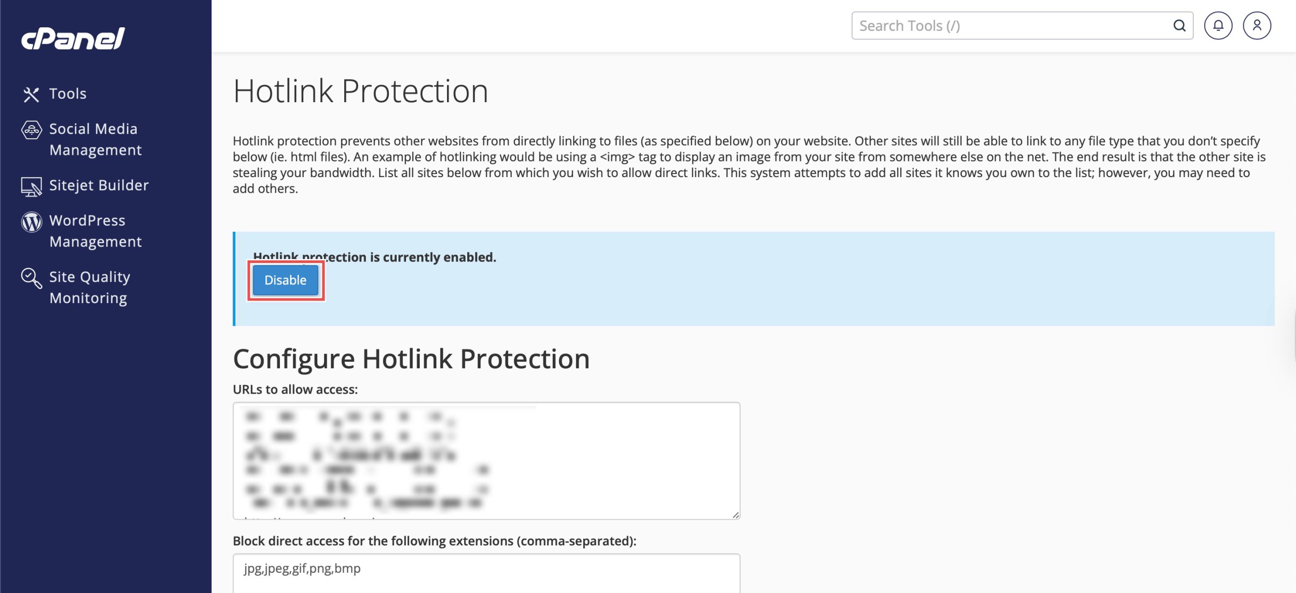 In the main configuration area, look for the status message: “Hotlink protection is currently enabled.“. Click the Disable button.