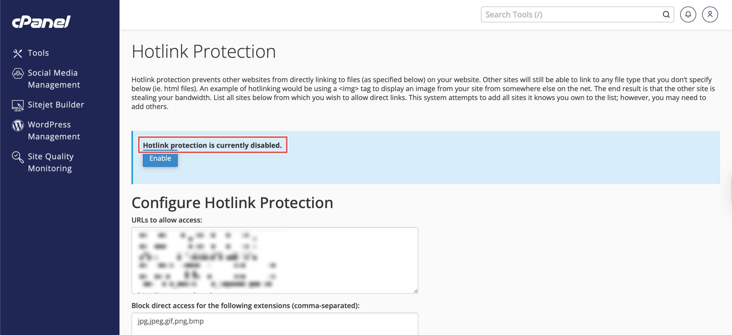 Under the Security section, click Hotlink Protection. You will see the configuration settings for your Hotlink Protection.