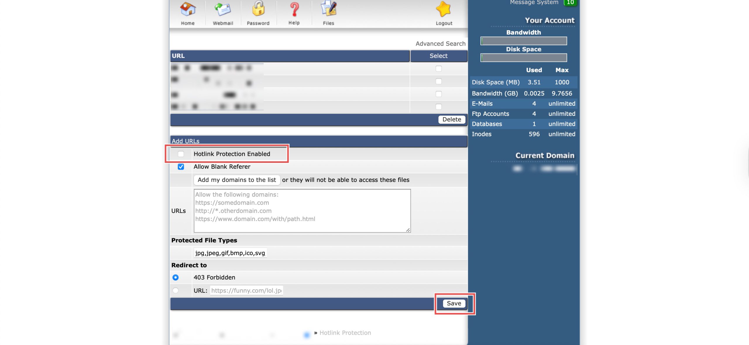 Under Add URLs, de-select Hotlink Protection Enabled checkbox. Then, click Save at the bottom right.