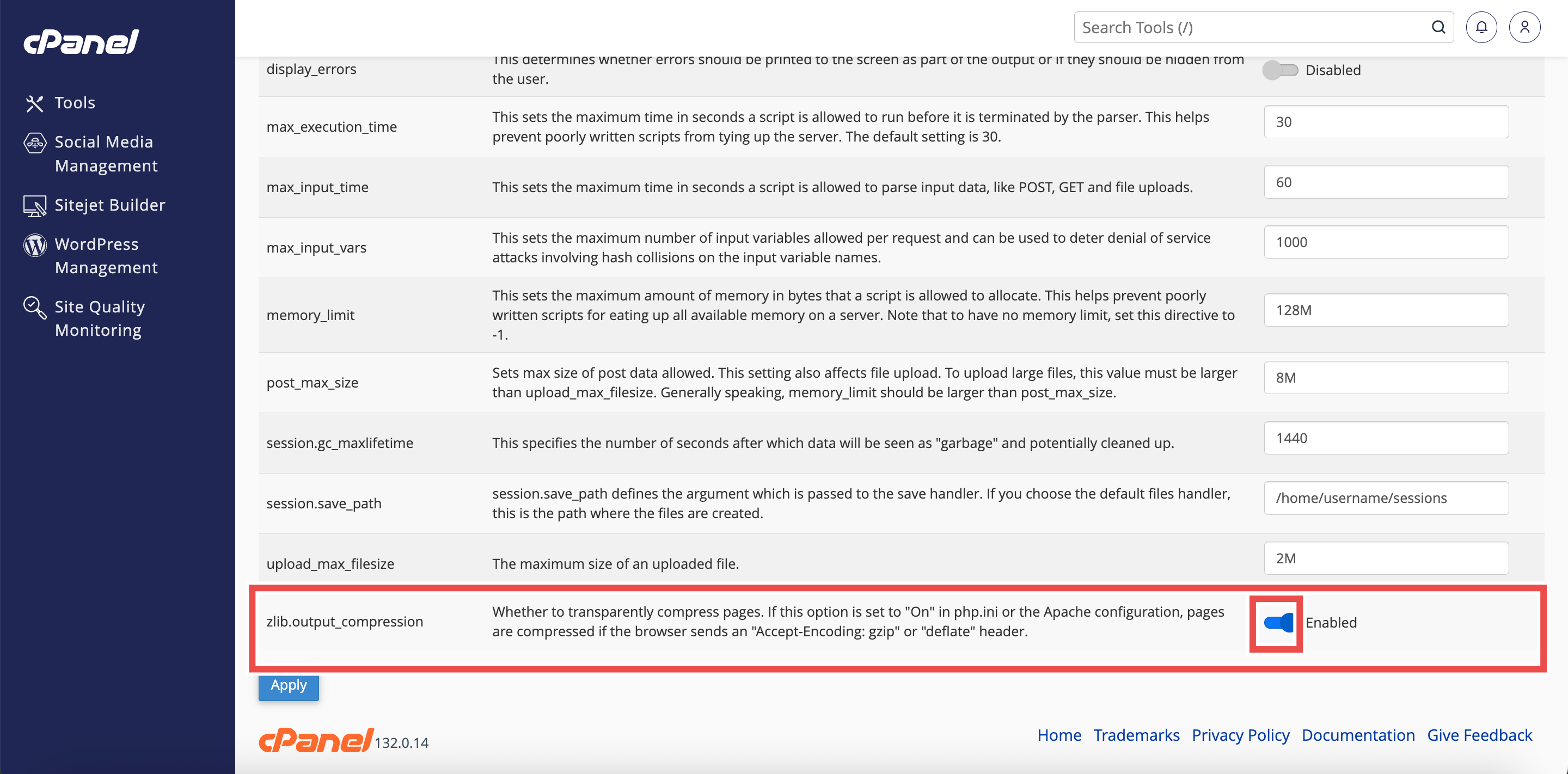 • Locate the zlib.output_compression directive in the list of PHP directives.
