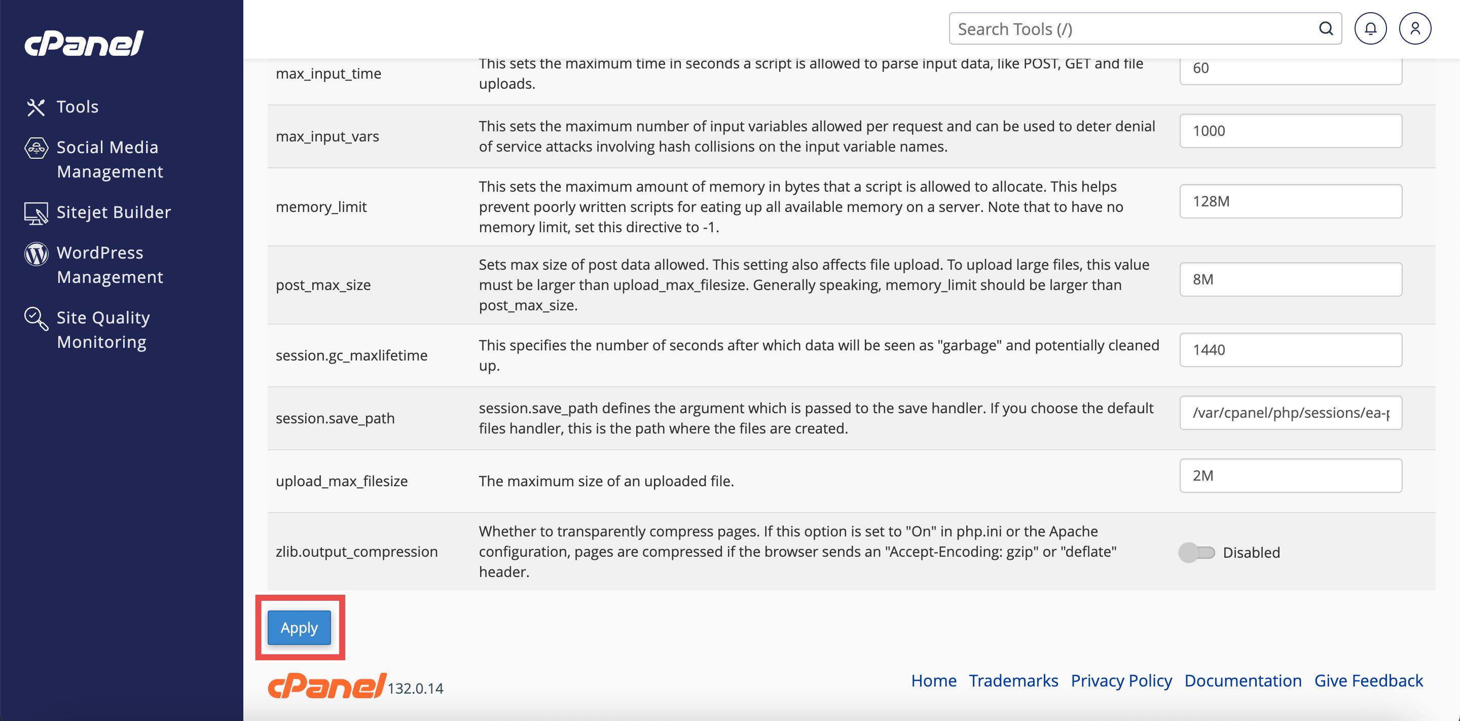 - Selecting a specific domain will apply PHP configuration changes only to that domain.
