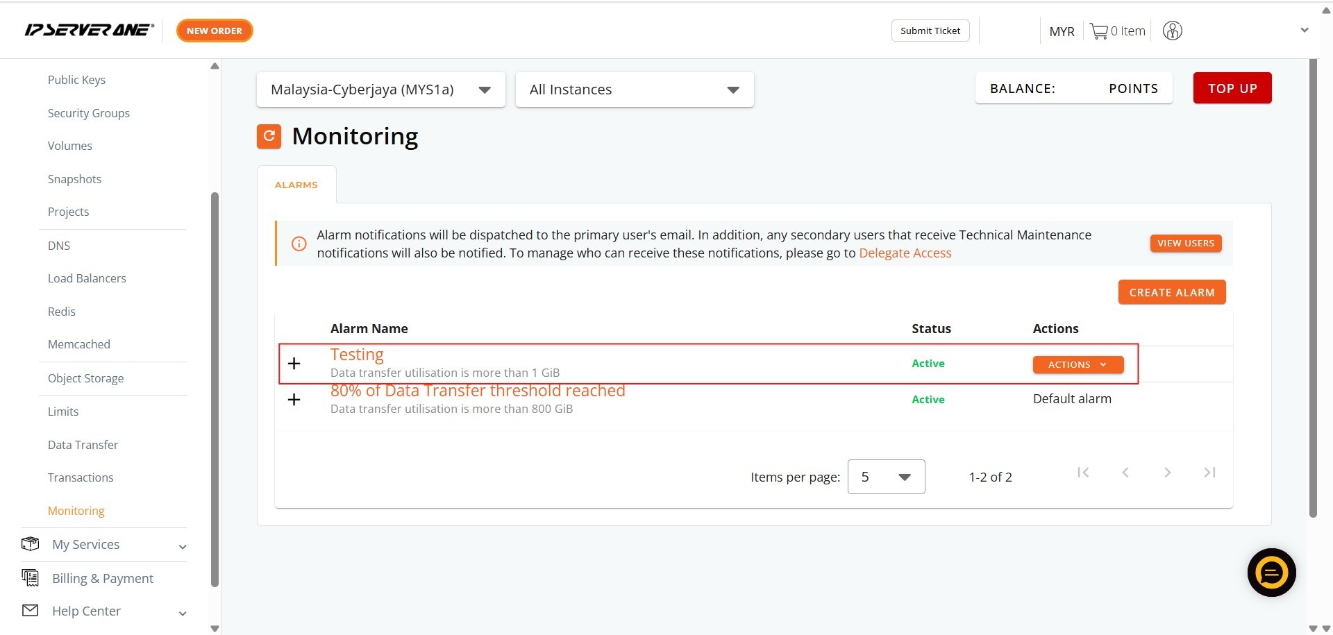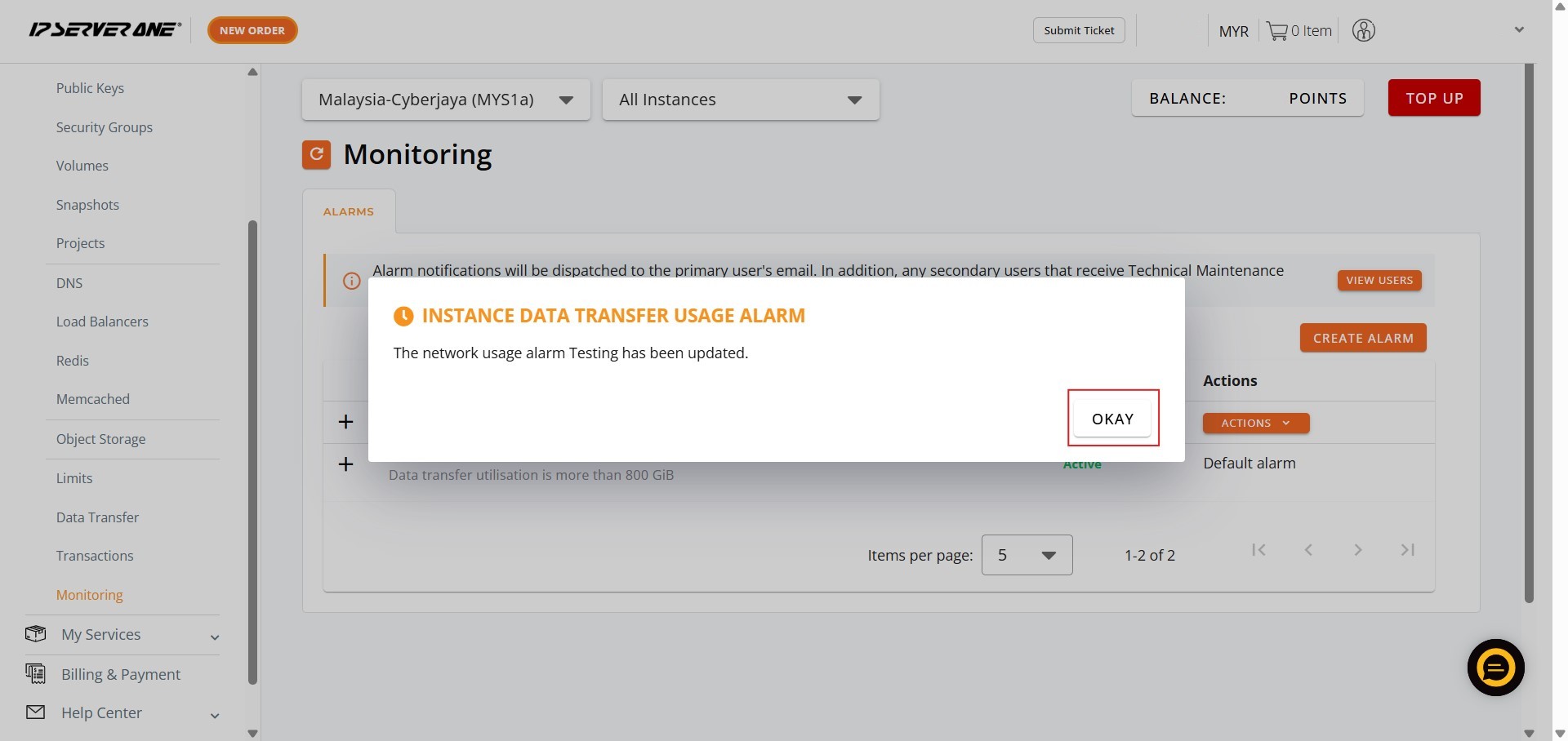 Monitoring your cloud resources is an essential function, readily available within the NovaCloud services section under the Monitoring tab in your Customer Portal. This feature allows you to set up alarms to track bandwidth usage for specific resources, such as Cloud Instances or GPU Instances.