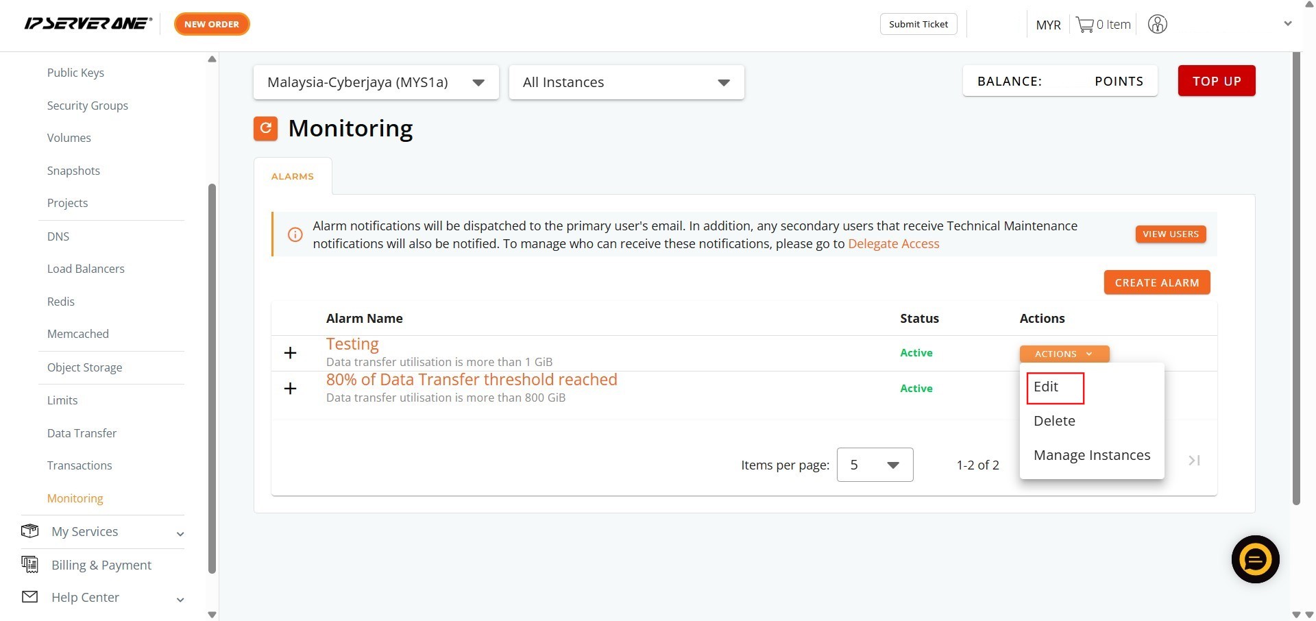 How to Edit Monitoring Bandwidth Usage Alarm Name in Customer Portal