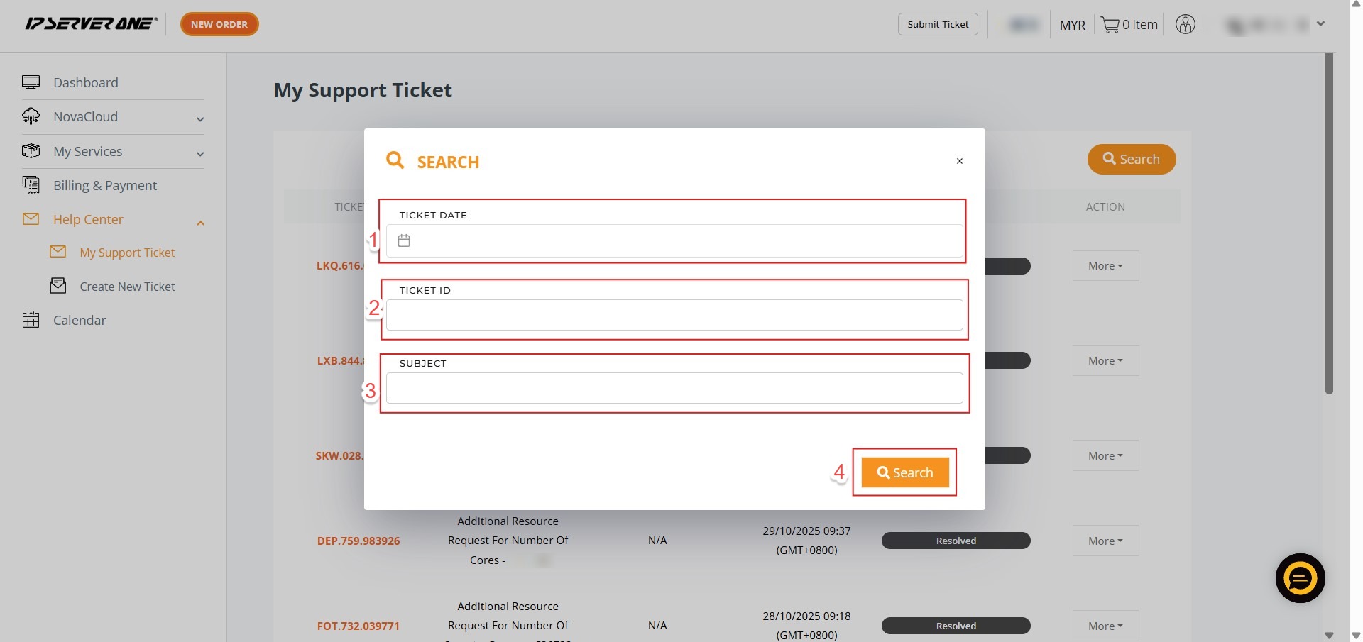 Instead of manually scrolling through a long history of requests, the “My Support Ticket” search functionality allows you to pinpoint specific records using parameters such as Ticket ID, Subject keywords, or Date ranges. This feature is particularly valuable when you need to review a specific solution provided by the technical team or monitor the progress of an active ticket, ensuring you have the information you need directly within the portal.