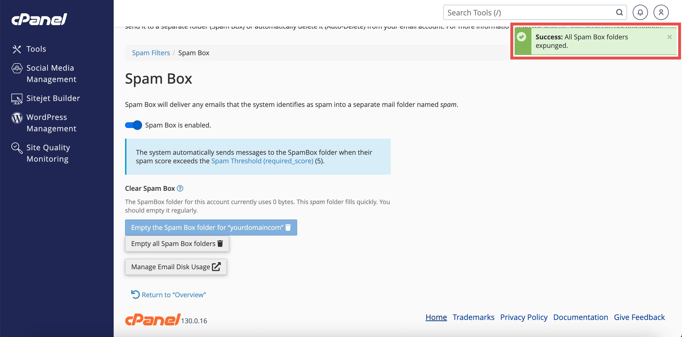 By following these steps, you can successfully empty the Spam Box folders using Spam Filters in cPanel. Regularly clearing your Spam Box helps manage your email quota and ensures optimal email performance.