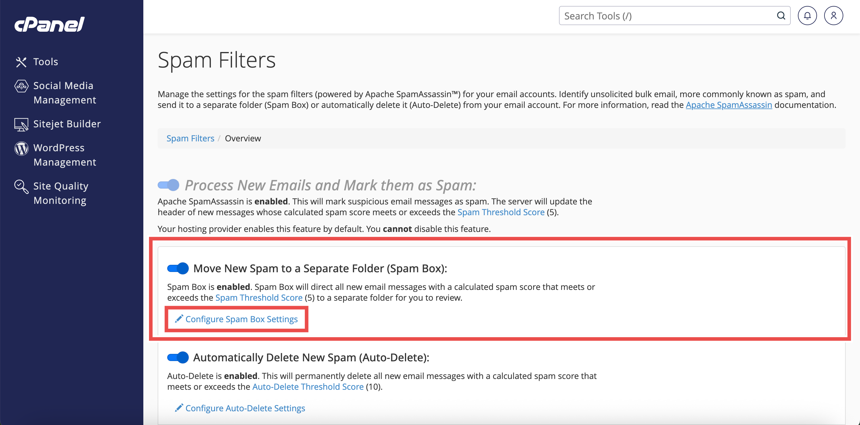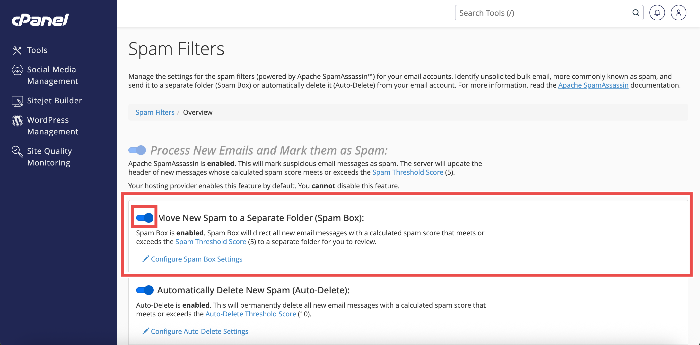 - Apache SpamAssassin and Spam Box feature must be enabled.