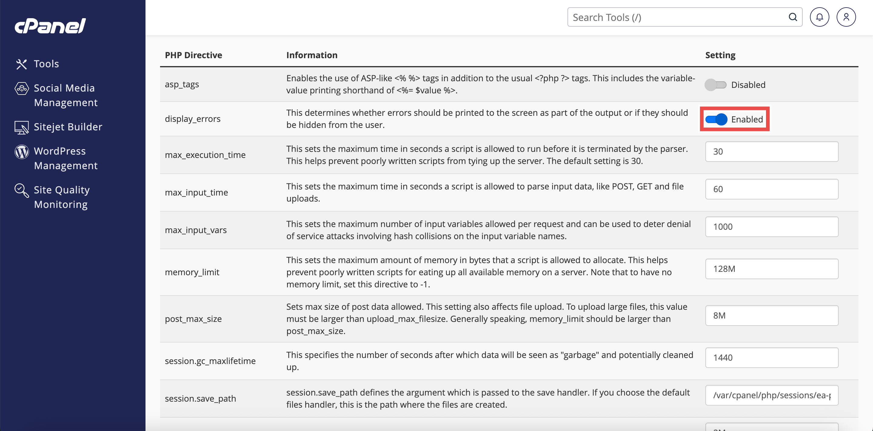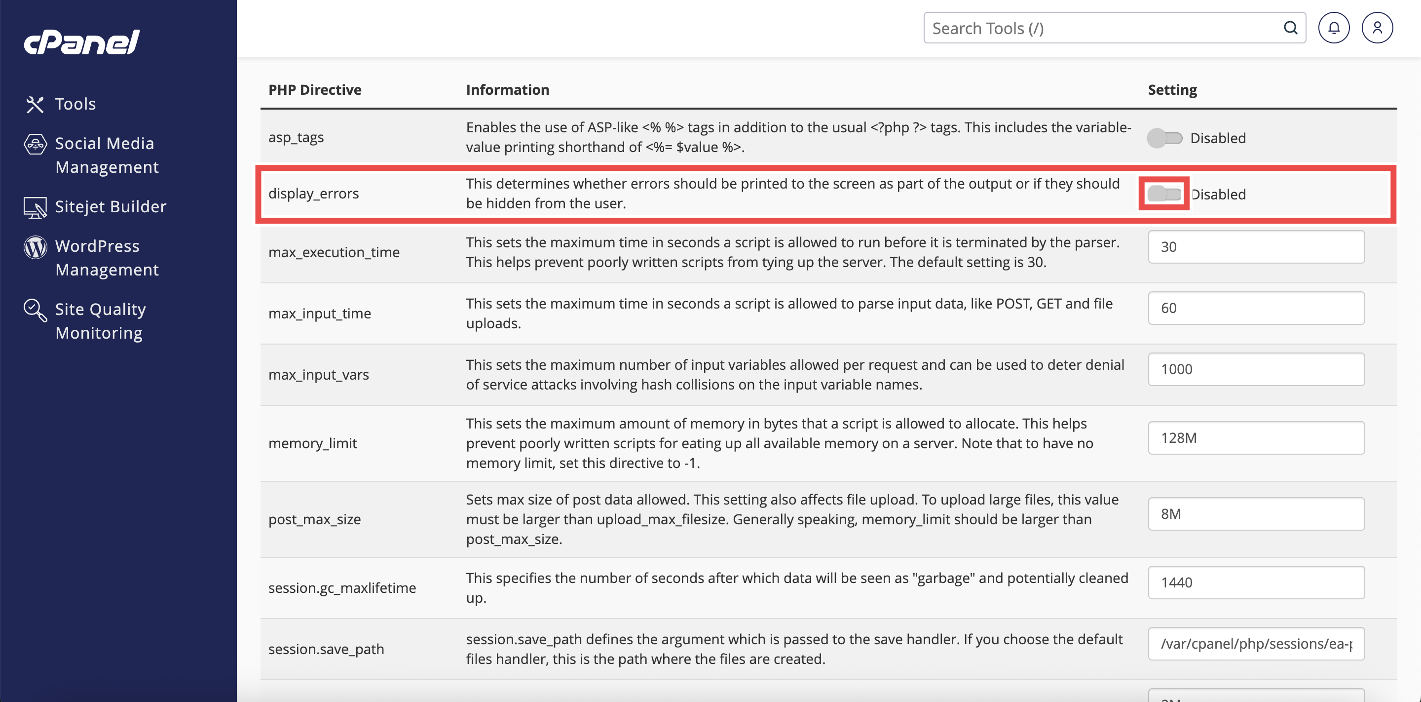 - Locate the display_errors directive in the list of PHP directives.