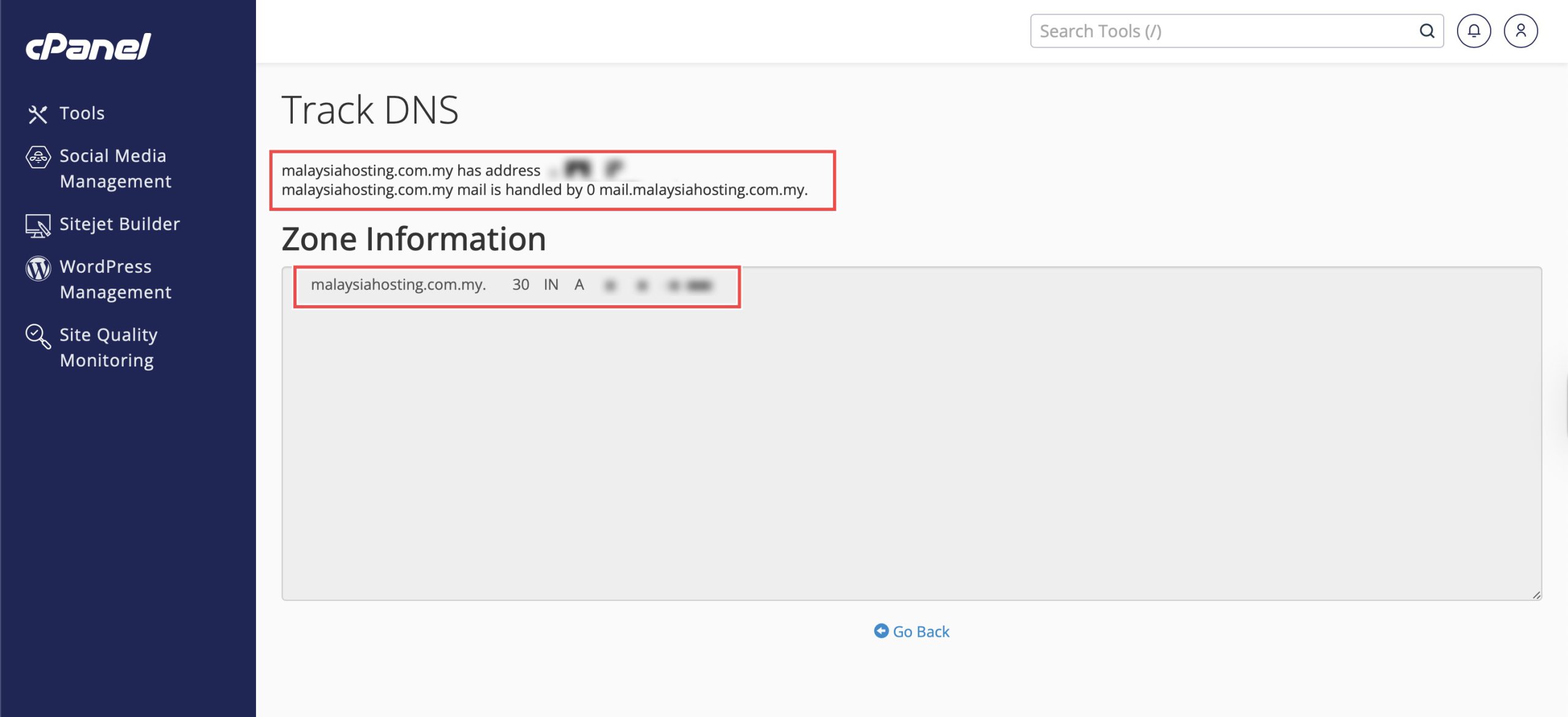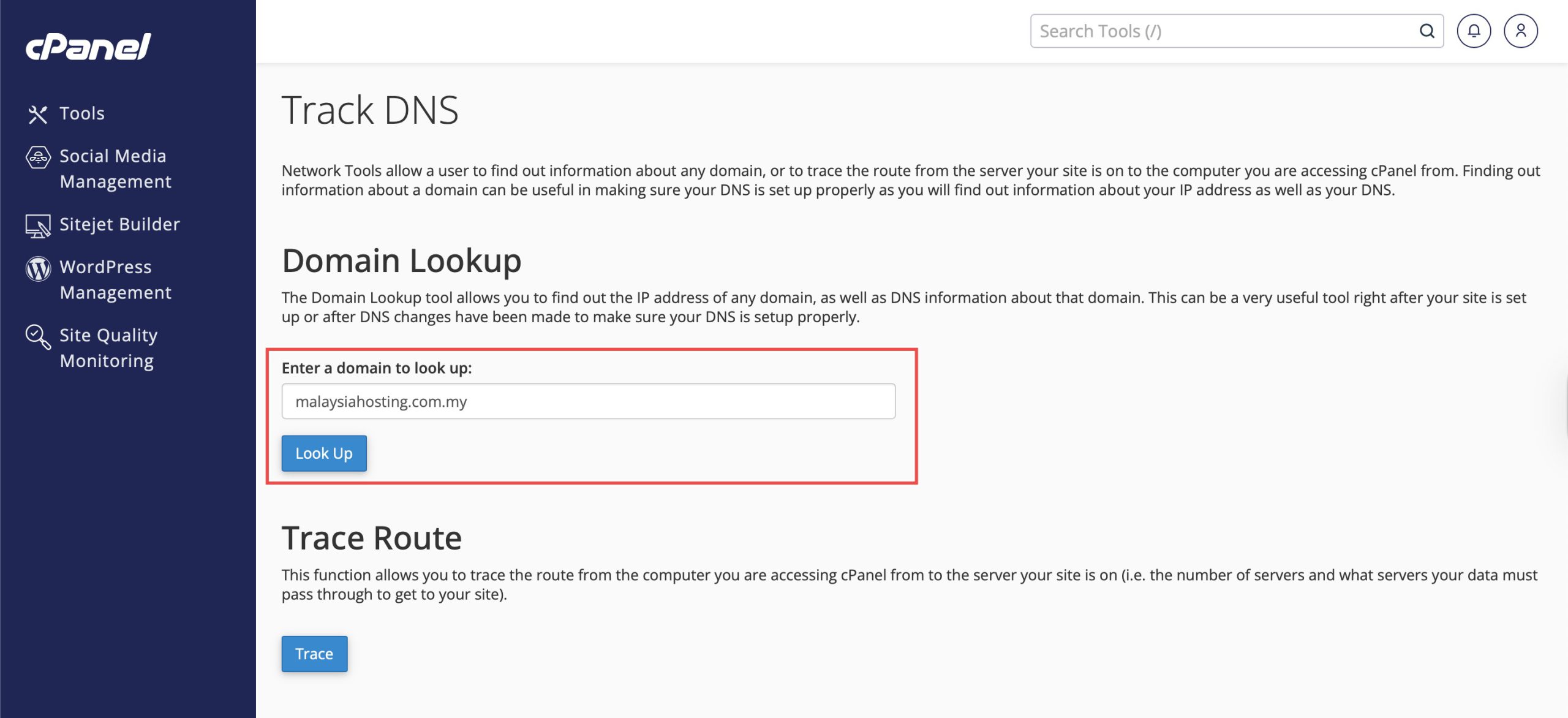 Using Track DNS through cPanel’s interface provides quick access to domain DNS information for verification and troubleshooting purposes. This built-in tool enables efficient DNS queries directly from your control panel, helping you confirm proper domain configuration and diagnose potential DNS-related issues.