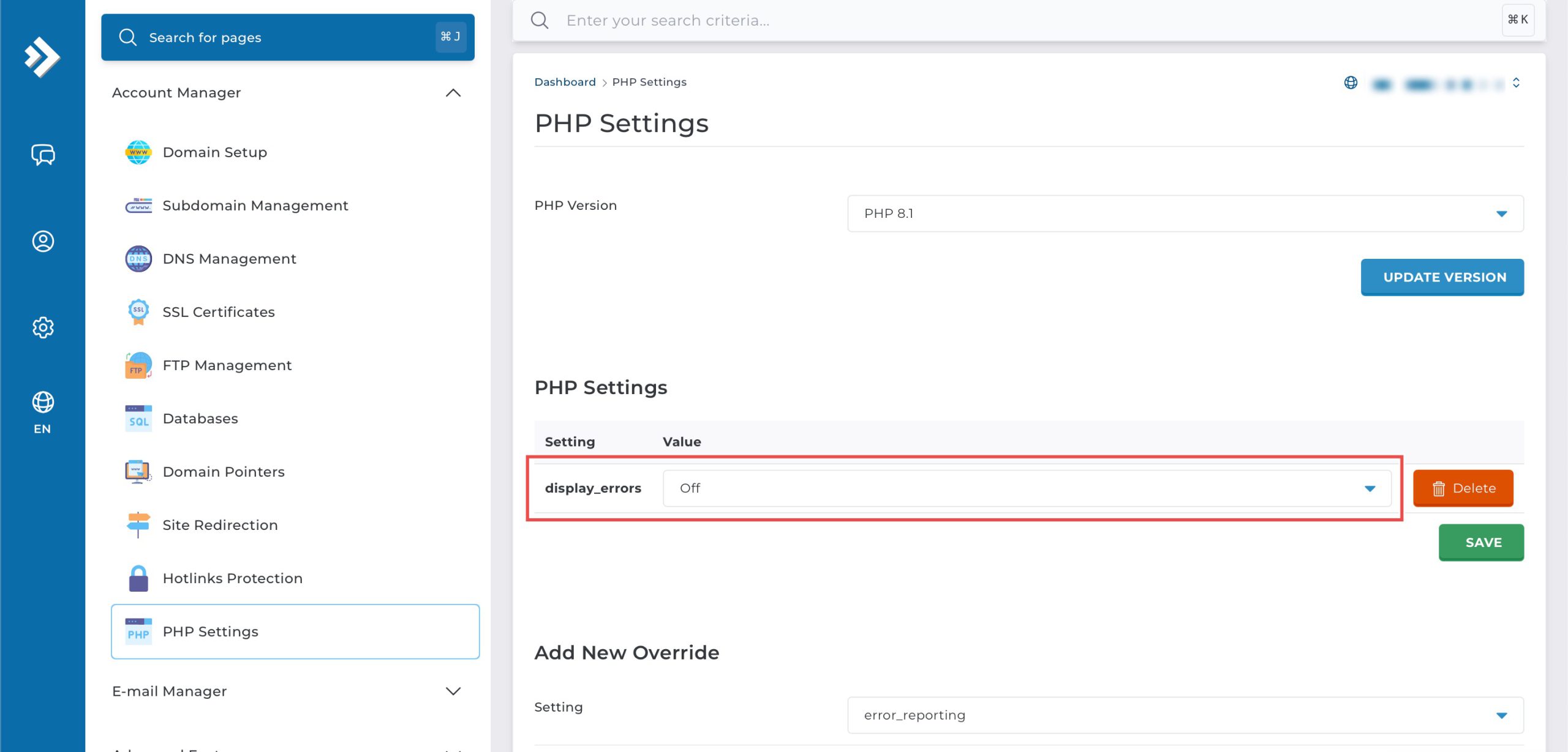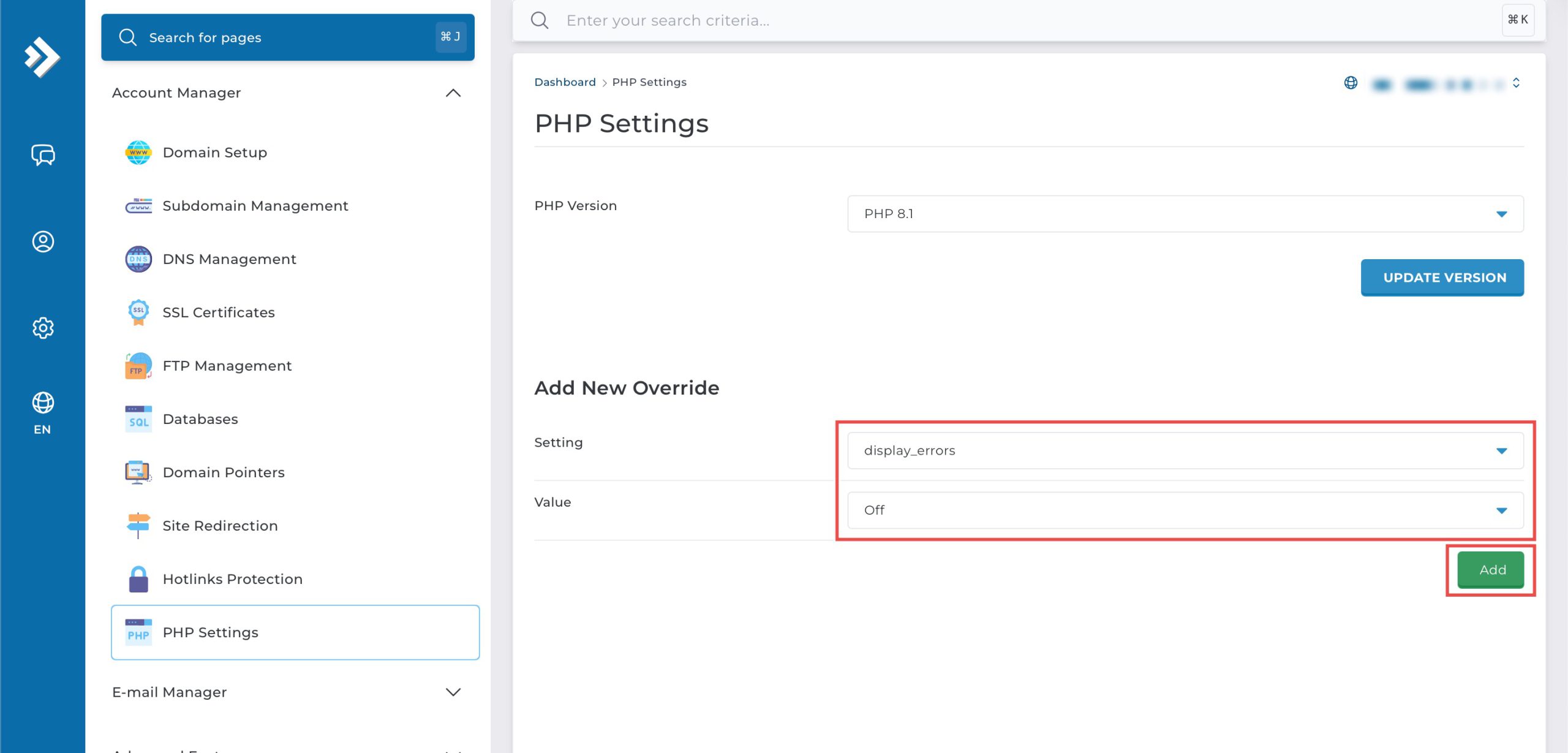 Scroll down to the Add New Override section. From the Setting drop-down menu, select display_errors. From the Value drop-down menu, select Off. Then, click Add on the bottom right.