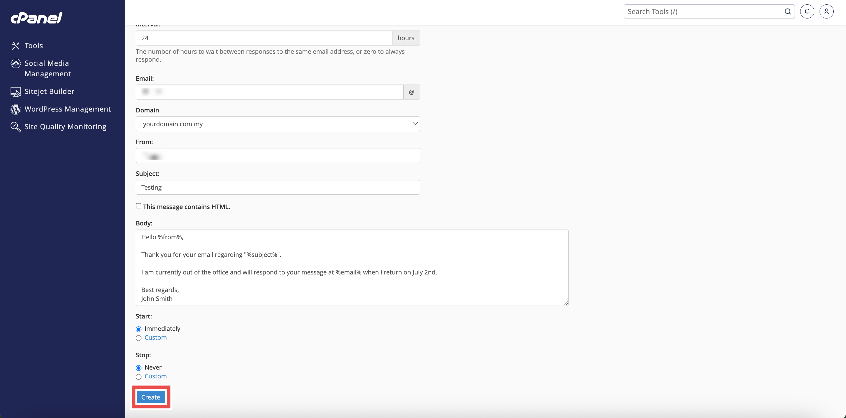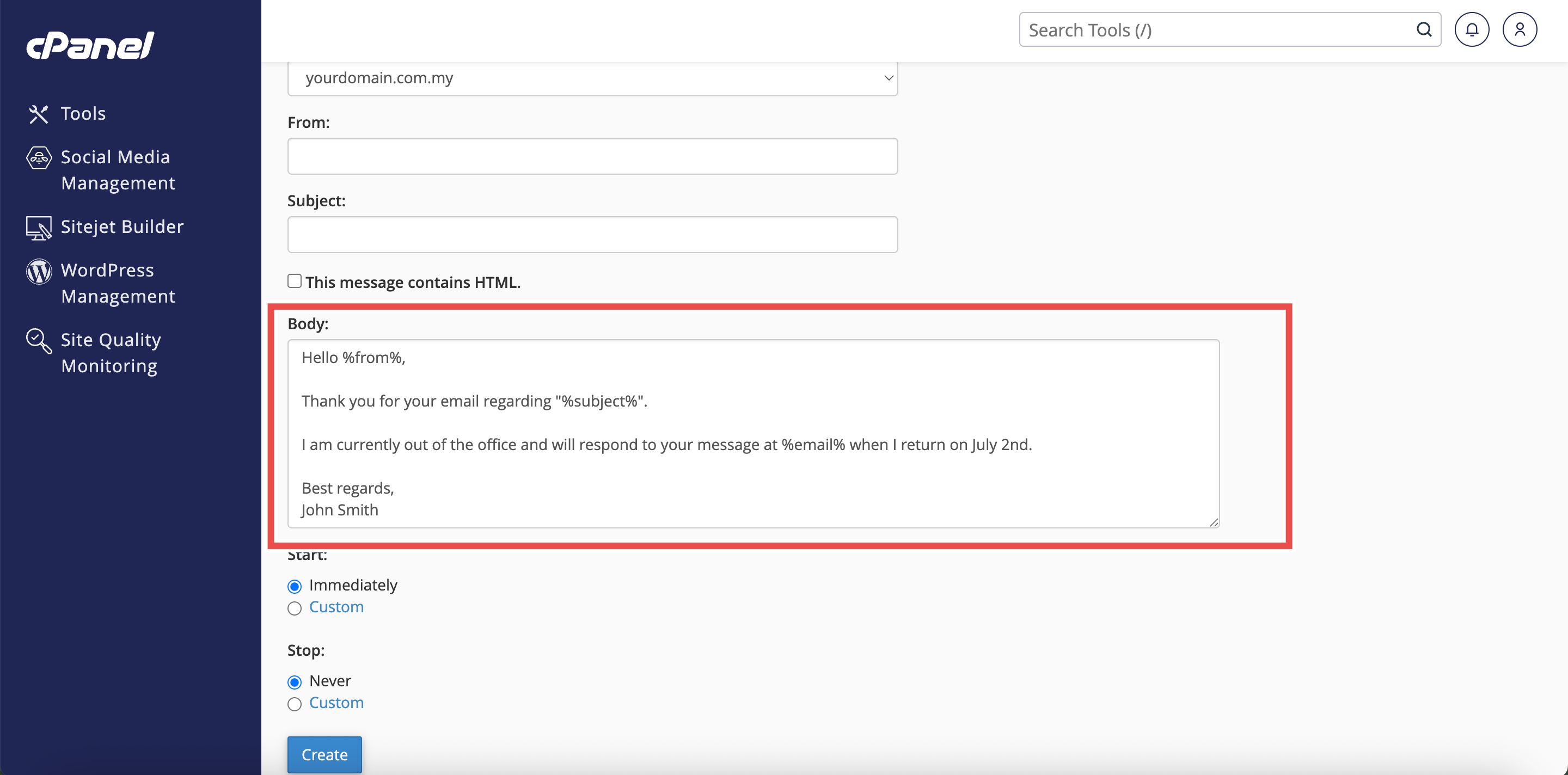 By following these steps, you can include sender information in autoresponses using cPanel. Personalizing automatic replies with sender details creates a more professional and engaging experience for your contacts, showing that their message was received and acknowledged. This is particularly valuable for business communications and customer service.