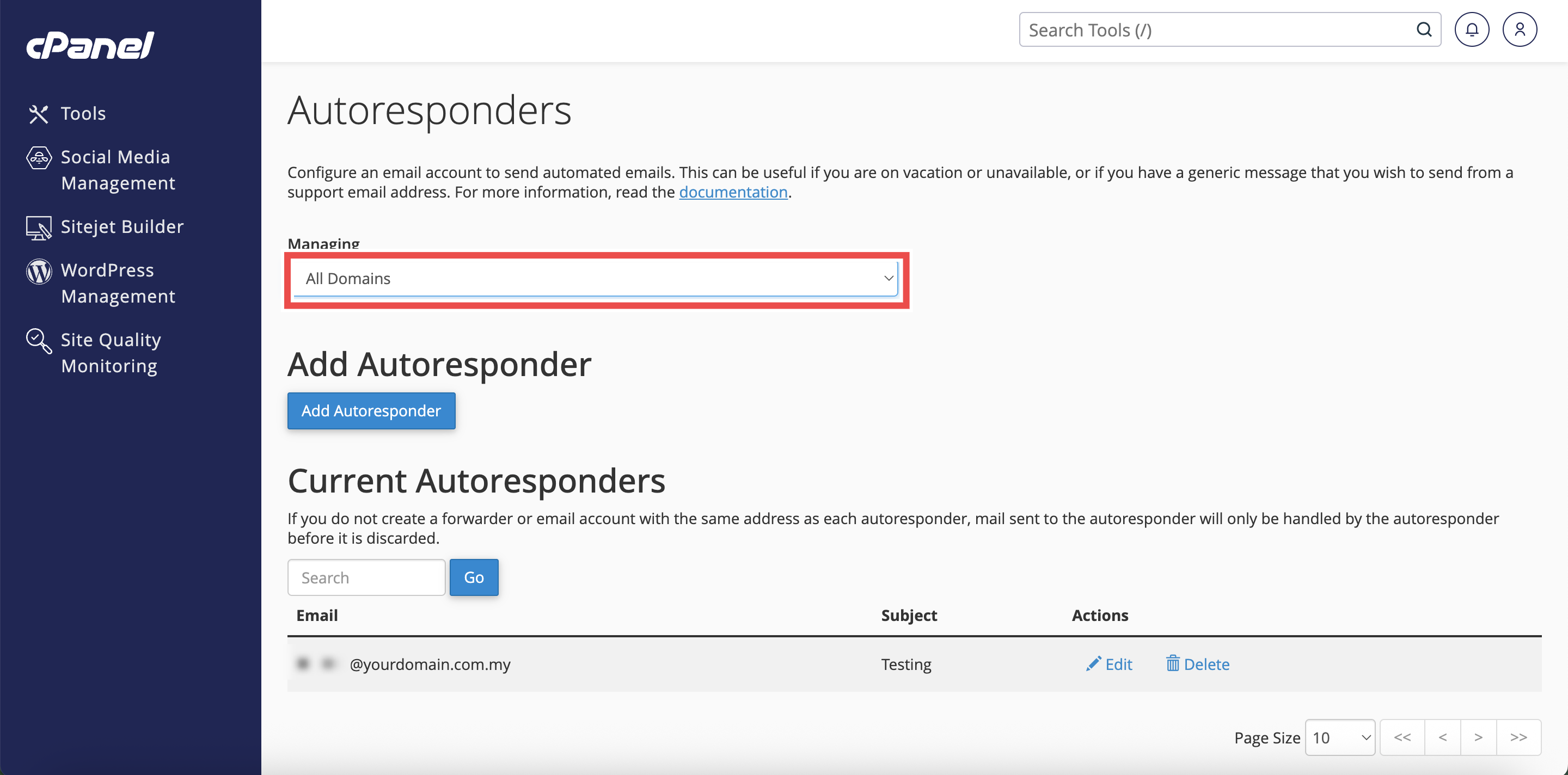 - From the Managing menu on the top left side of the interface, select the domain for which you want to configure an autoresponder.