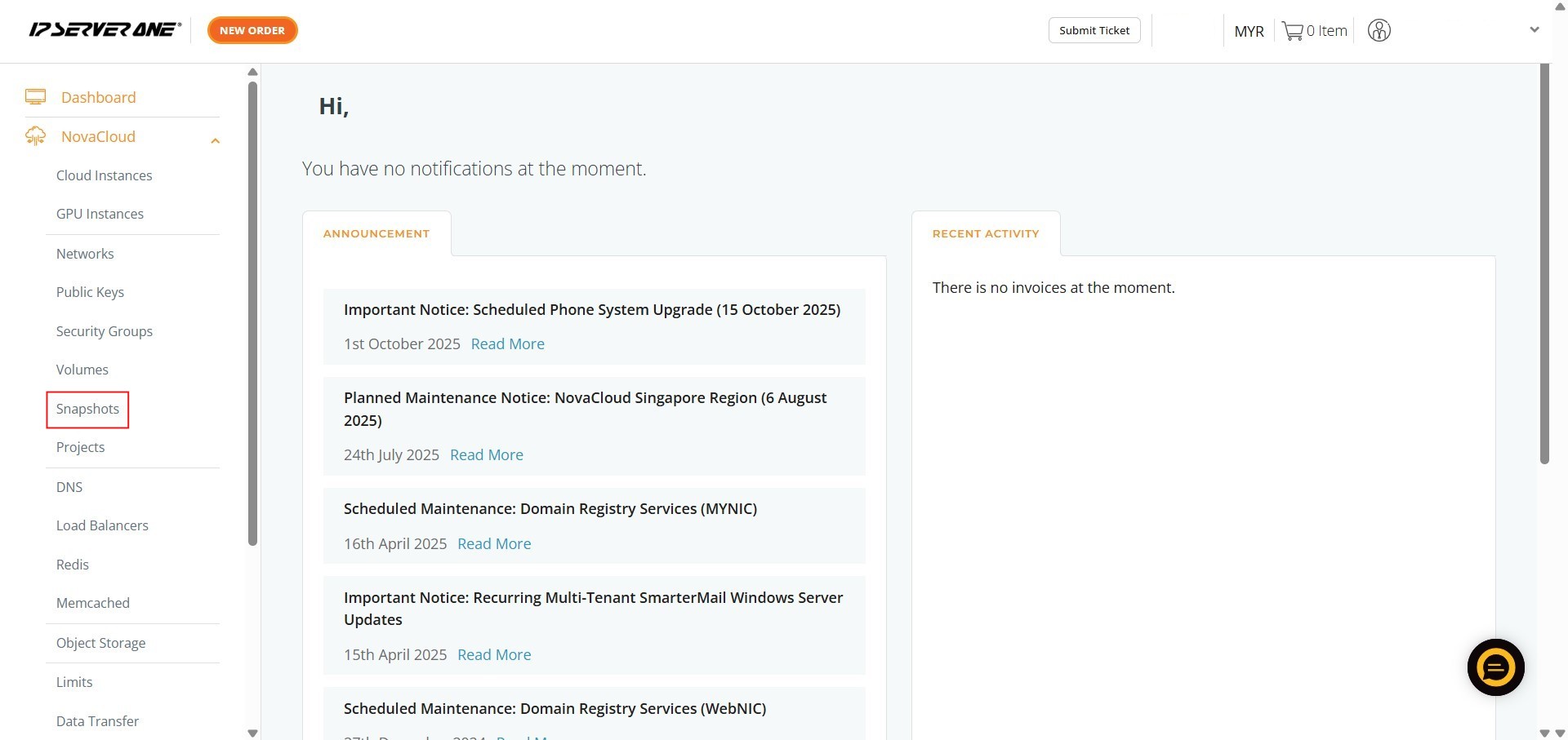 • Within the NovaCloud menu, click on the Snapshots section to view your existing storage.