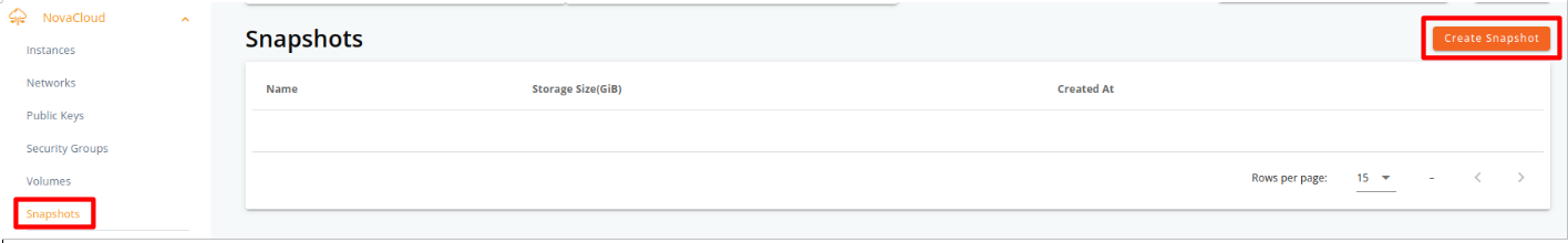 Note: If you do not have any volume in this tab and would like to create a new volume for a snapshot, you may do so by clicking Create Volume to create a blank volume or Create Volume from Image to create a bootable volume.
