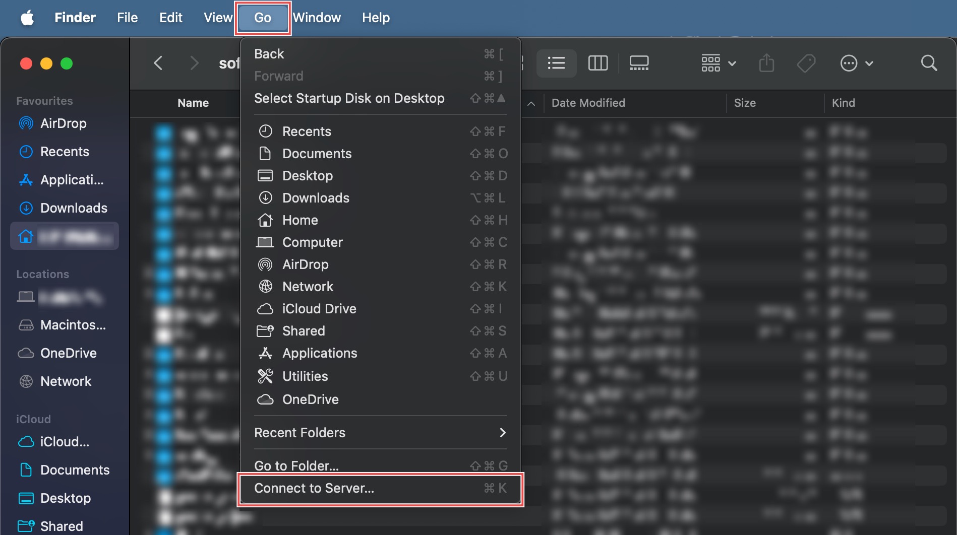 Open Apple’s Finder application. From the top menu bar, click Go, and then select Connect to Server.