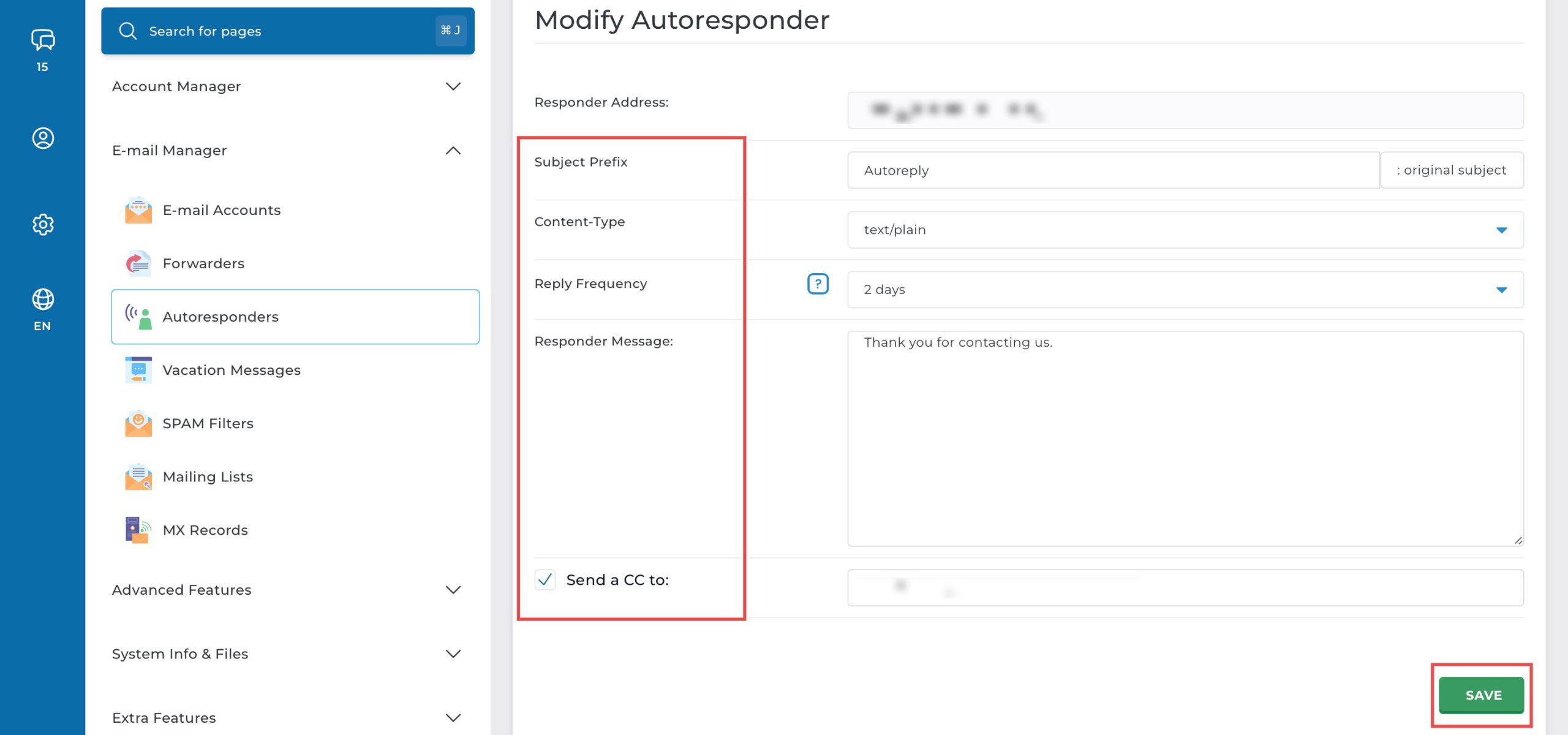 - Send a CC to: Optionally, send a CC of every email that triggers the autoresponder.