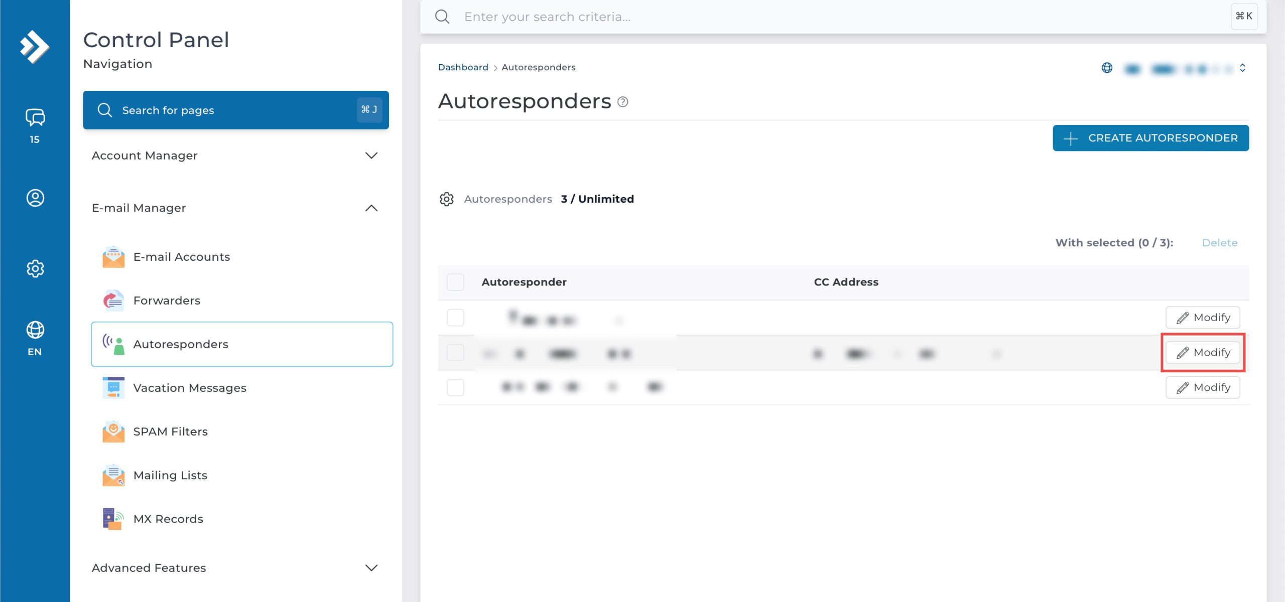 Locate the email address whose settings you wish to modify. Then, click Modify on the right of the row.
