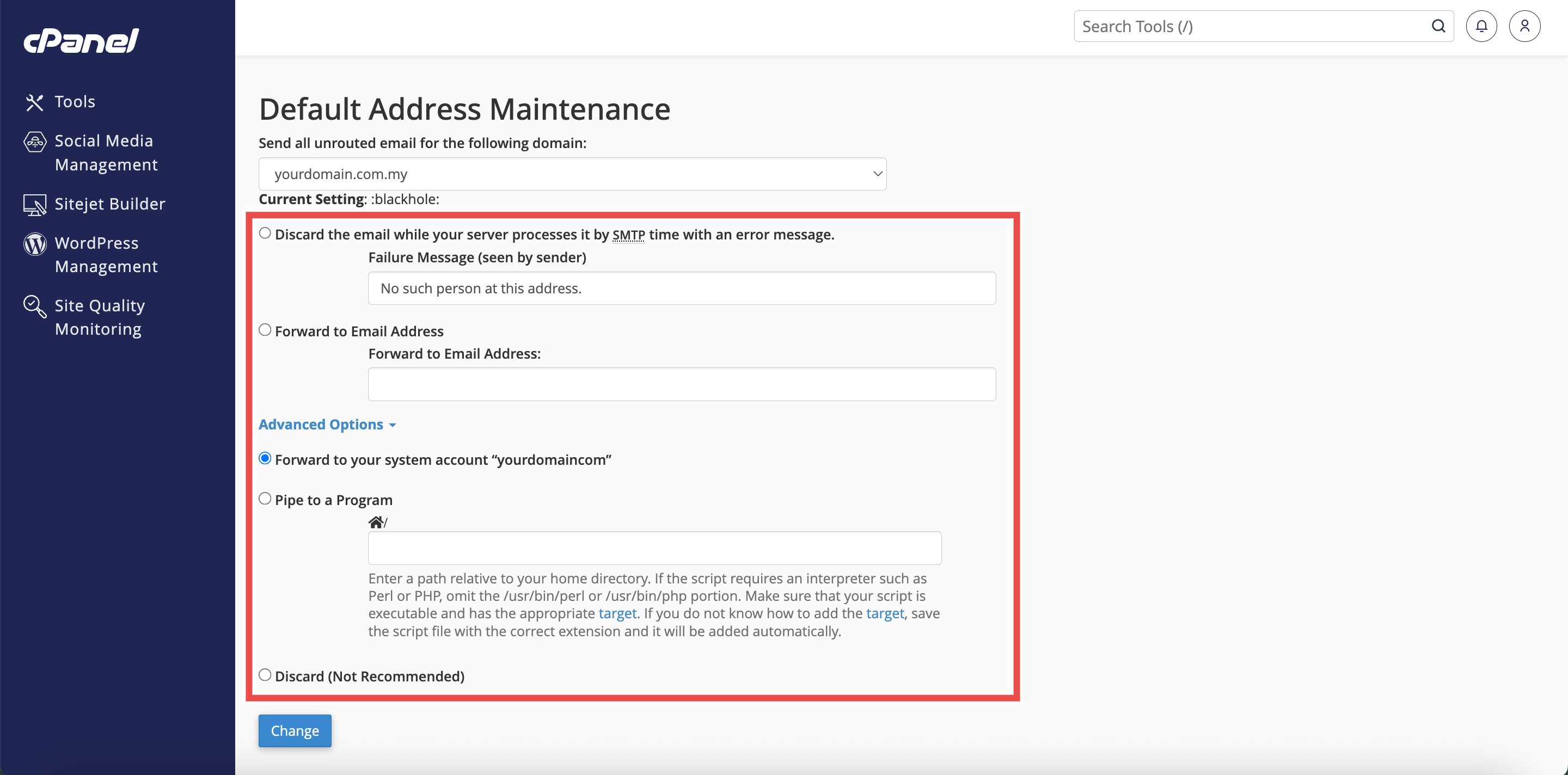 By following these steps, you can modify a default address in cPanel. Updating your default address configuration allows you to adapt to changing email management needs, improve spam handling, or update forwarding destinations. Regular review and modification of default address settings ensures optimal email delivery and management for your domain.