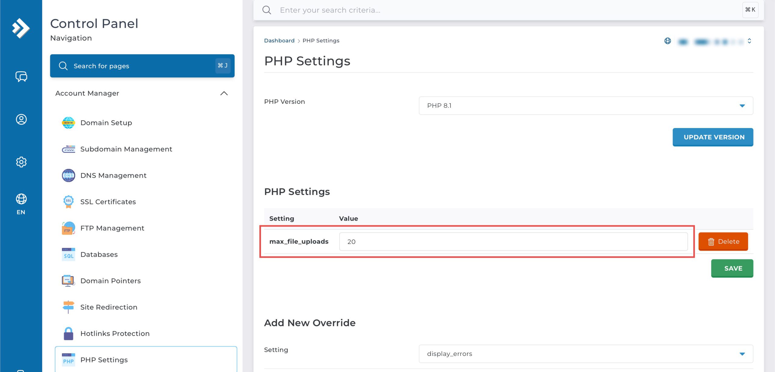 Scroll down to the Add New Override section. From the Setting drop-down menu, select max_file_uploads. In the Value field, you may enter the number of files that you wish to allow to be uploaded simultaneously in a single request.