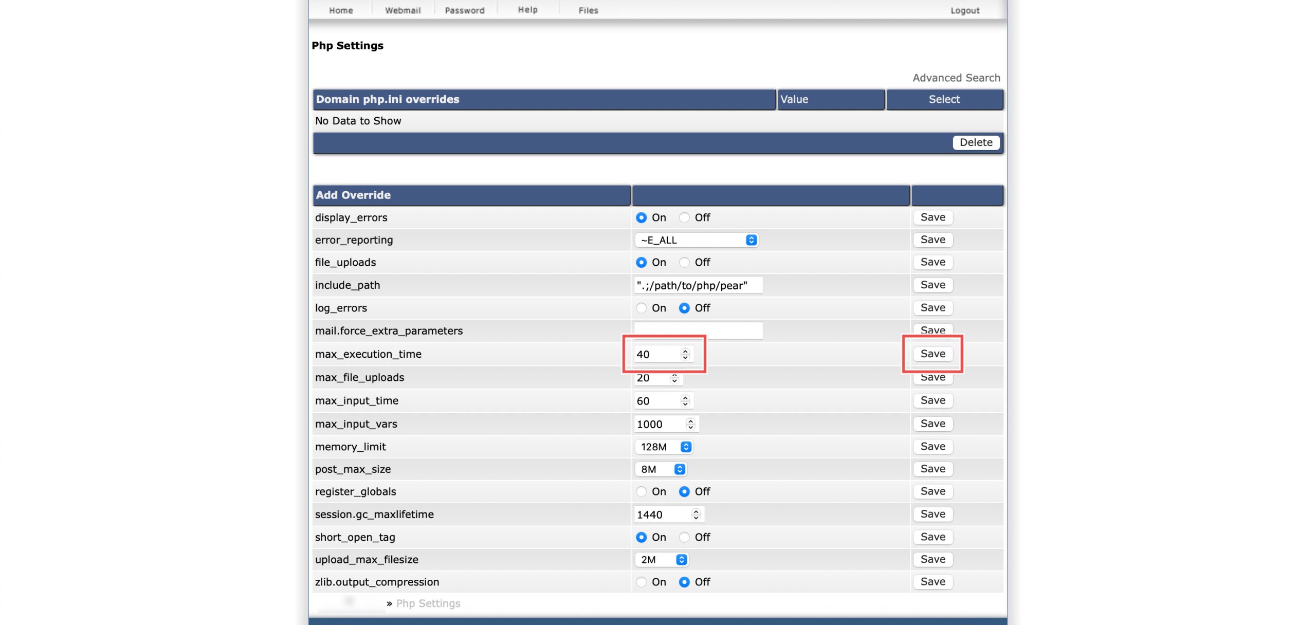 Scroll down to the Add Override section. On the max_execution_time row, you may enter the number of seconds a PHP script is allowed to run before the server forcibly terminates it.