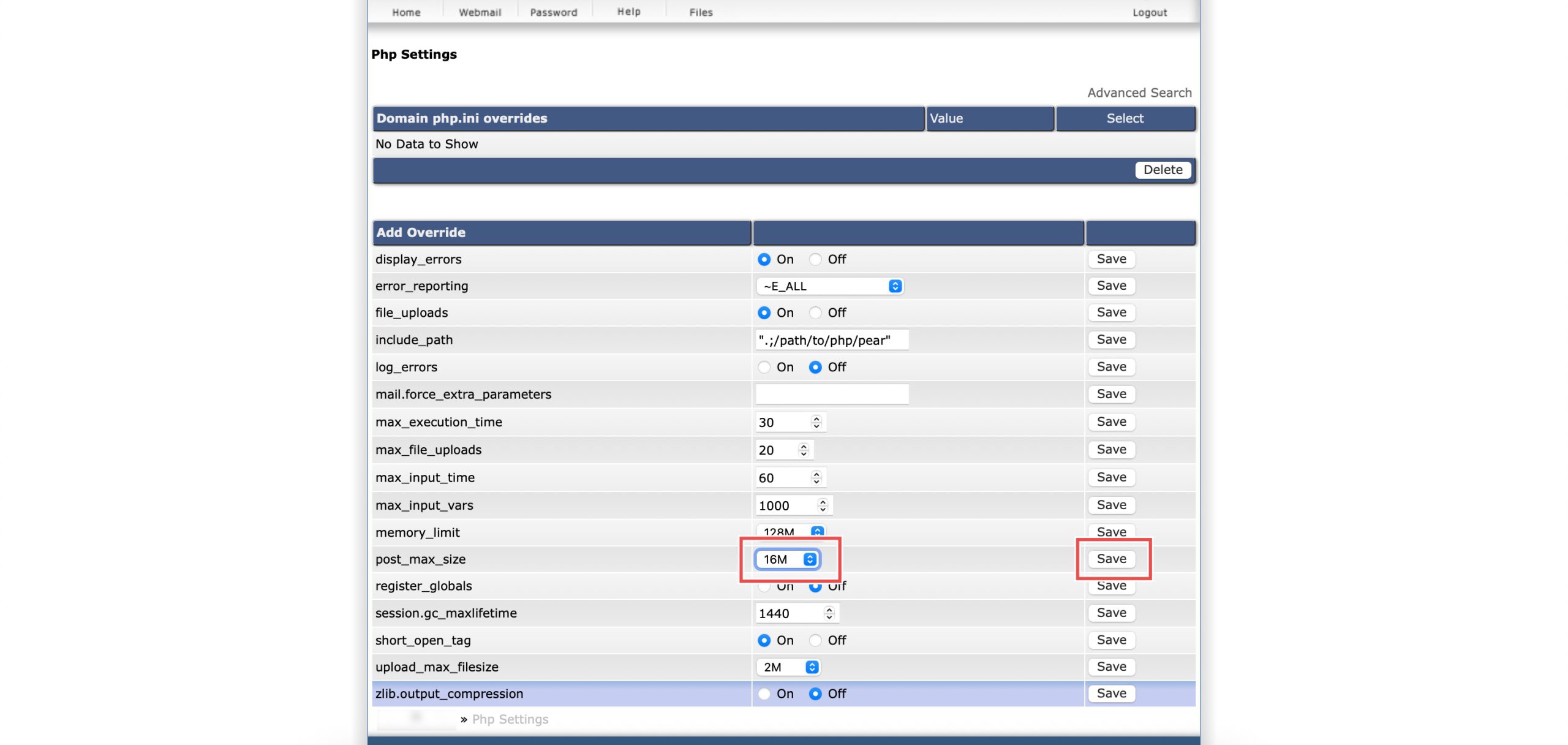 Scroll down to the Add Override section. On the post_max_size row, you may select the maximum size of POST data that you wish PHP will accept.