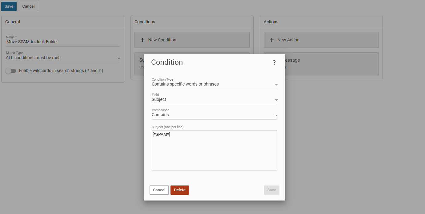 - In the Condition section, specify how SmarterMail should identify SPAM emails.