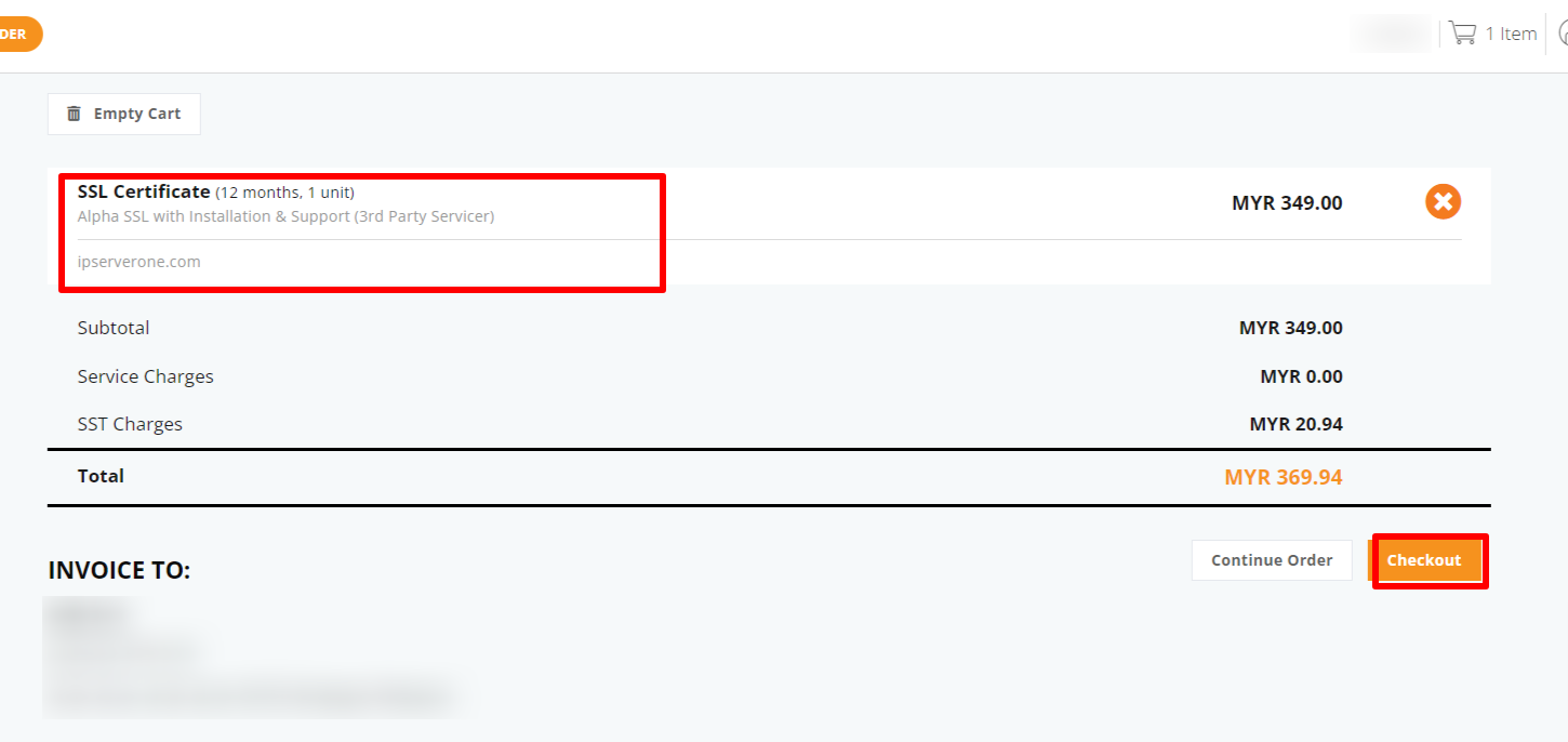 Ensure the domain name and desired SSL certificate are correct and click Check out.