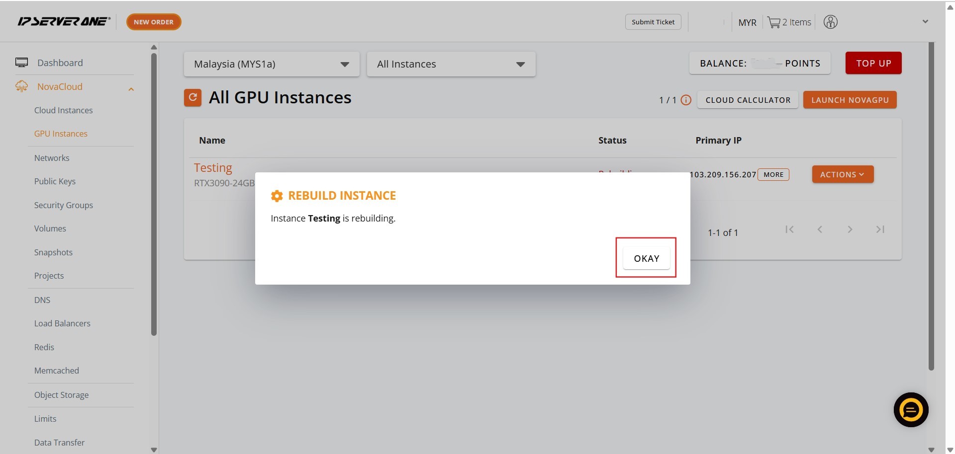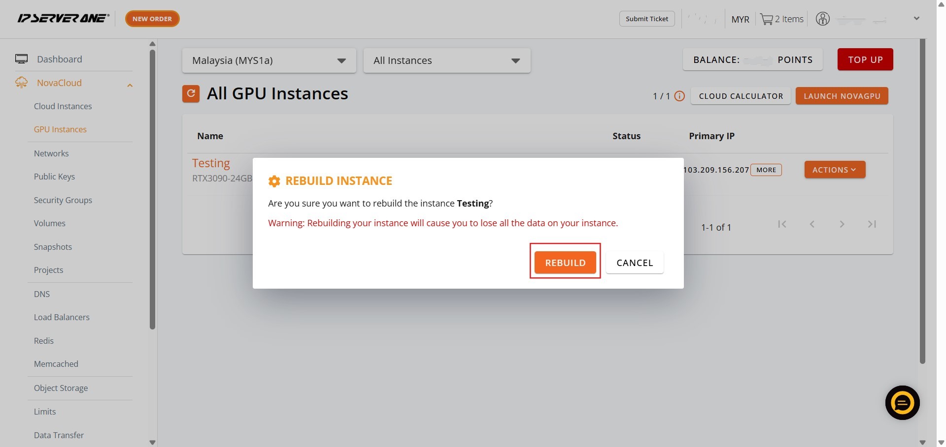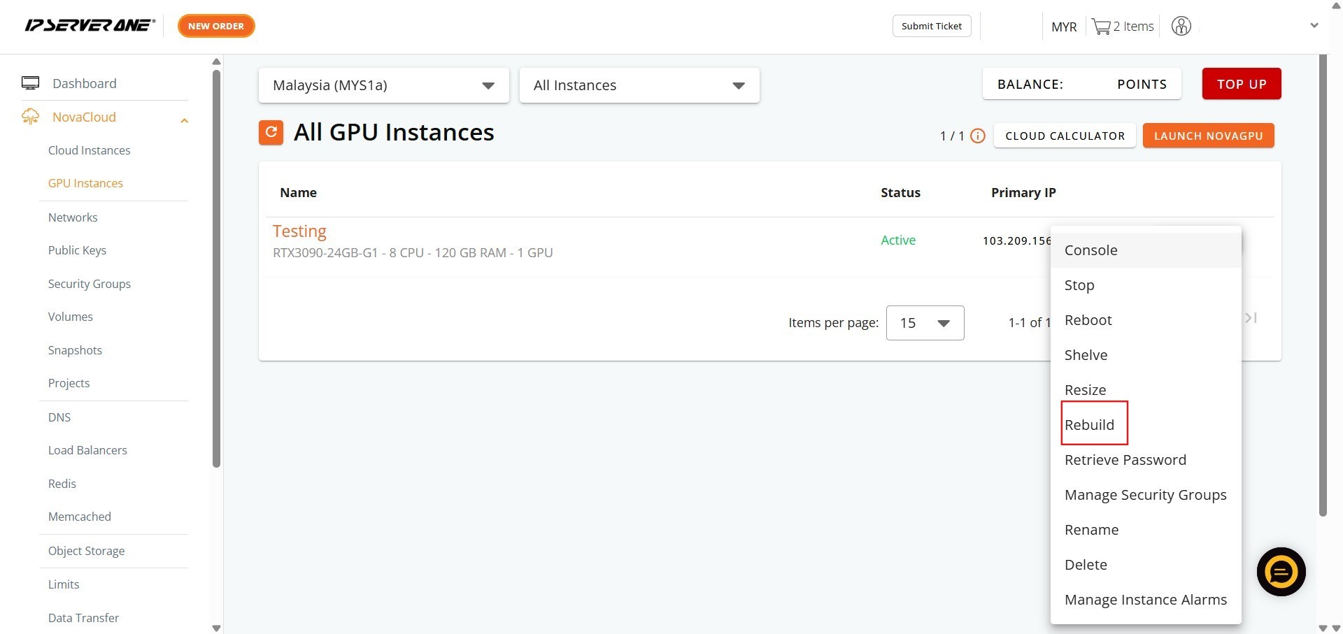 This guide outlines the professional, step-by-step procedure to execute a Rebuild of your GPU Instance(s) using the self-service management tools available within the NovaCloud section of the Customer Portal. By following this process, users can efficiently reset their environment to ensure a clean slate, thereby provisioning a robust foundation for future project advancements. The rebuild function is accessible directly via the Actions menu for your GPU Instance within the portal.