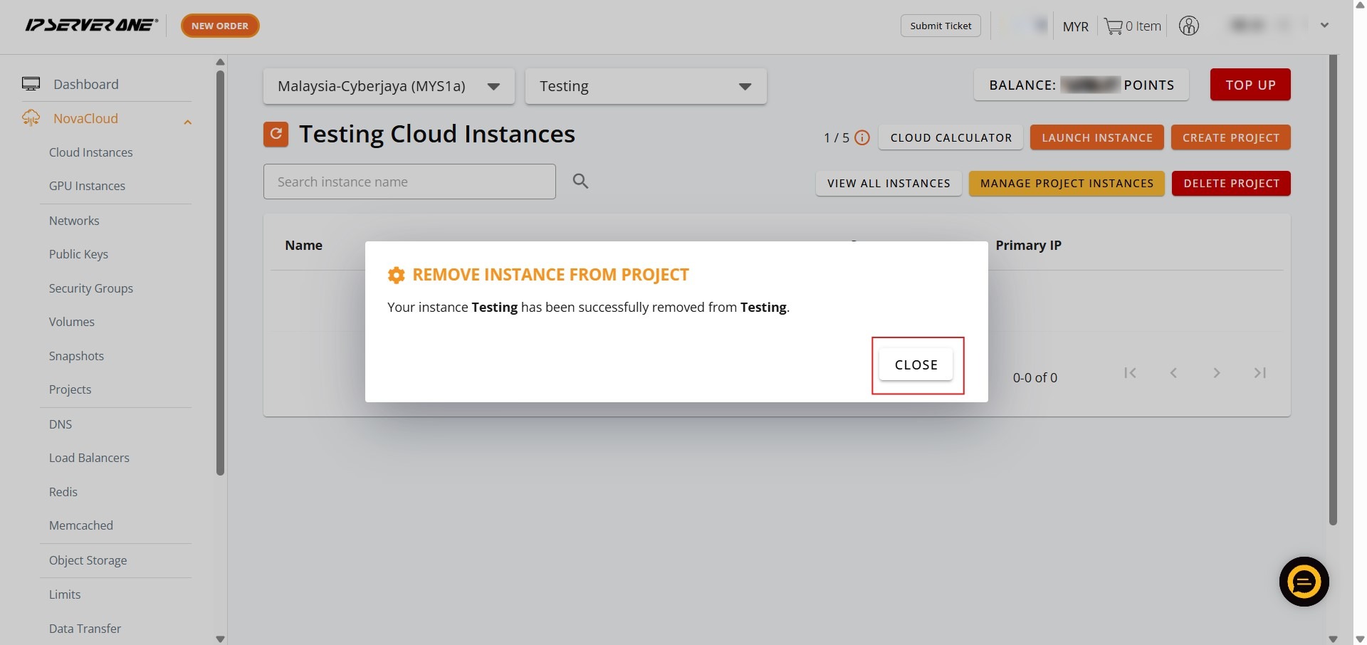 By following the outlined steps, you have successfully reorganized your resources by removing an instance from a specific Project Group via the NovaCloud > Project interface. This administrative action allows for a more flexible and accurate representation of your current infrastructure within the IP ServerOne Customer Portal.