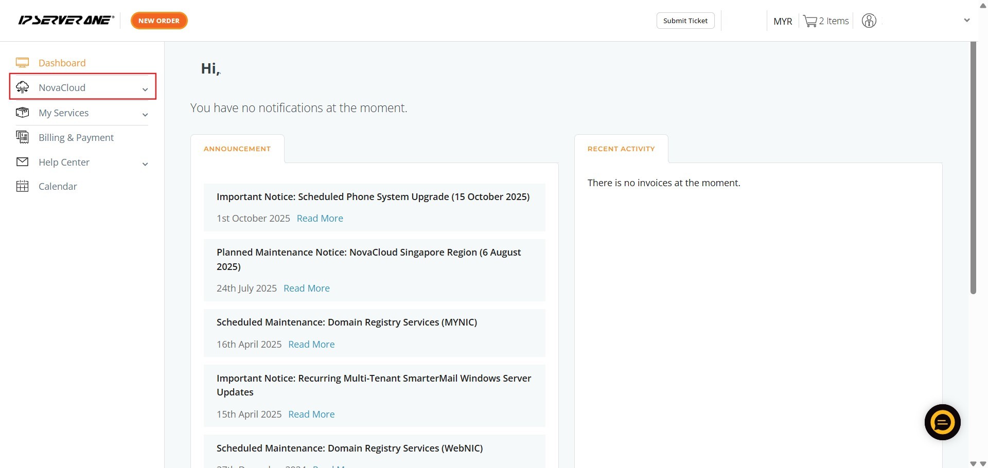 - From the main dashboard, locate and select NovaCloud on the left-hand navigation menu.