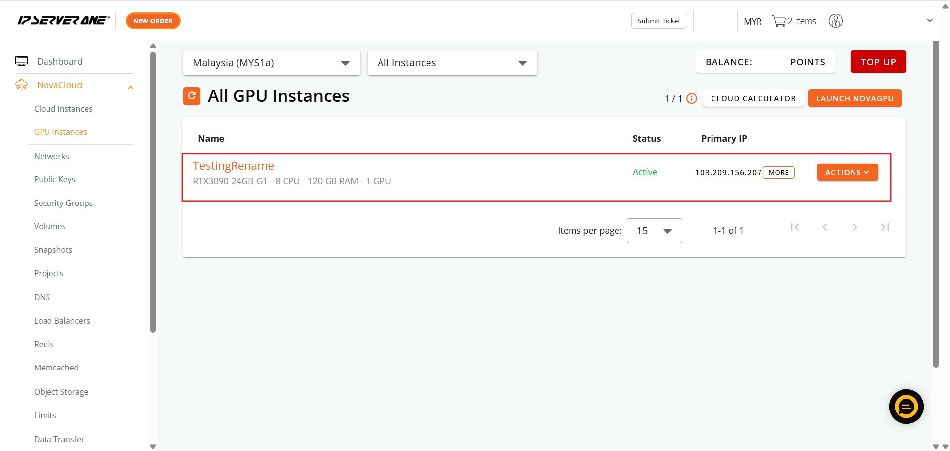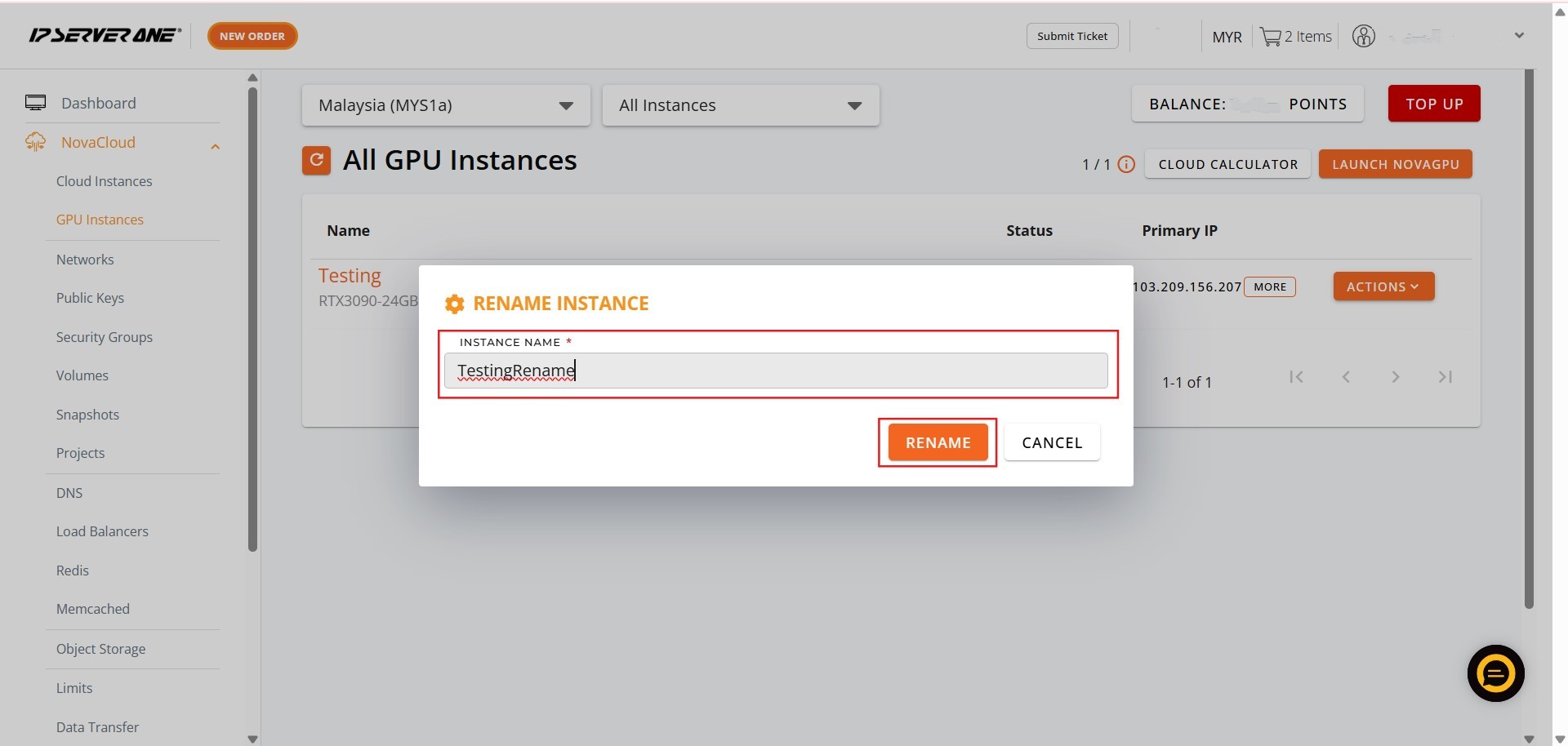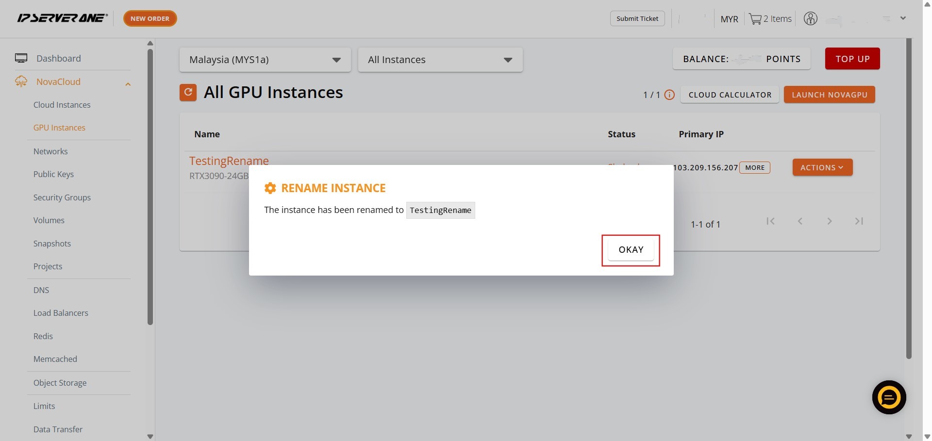 You have now successfully renamed your GPU instance within the NovaCloud services section of the Customer Portal.