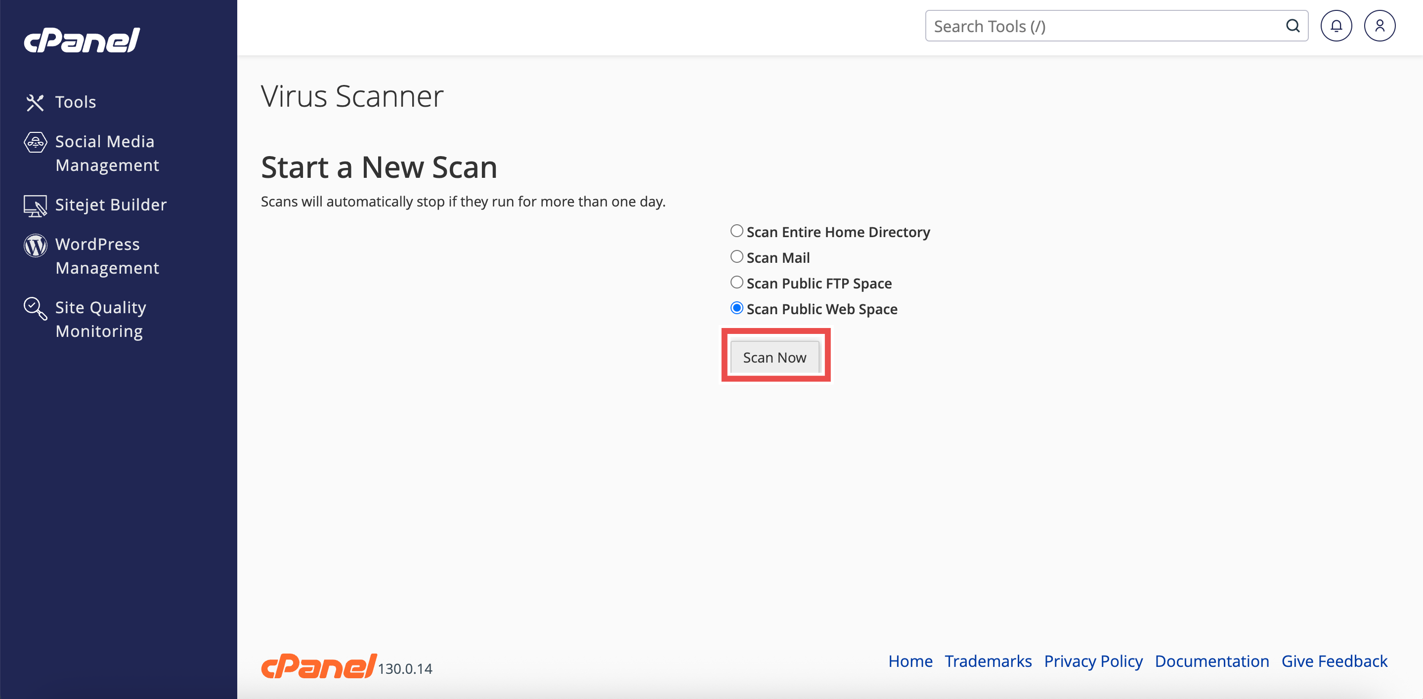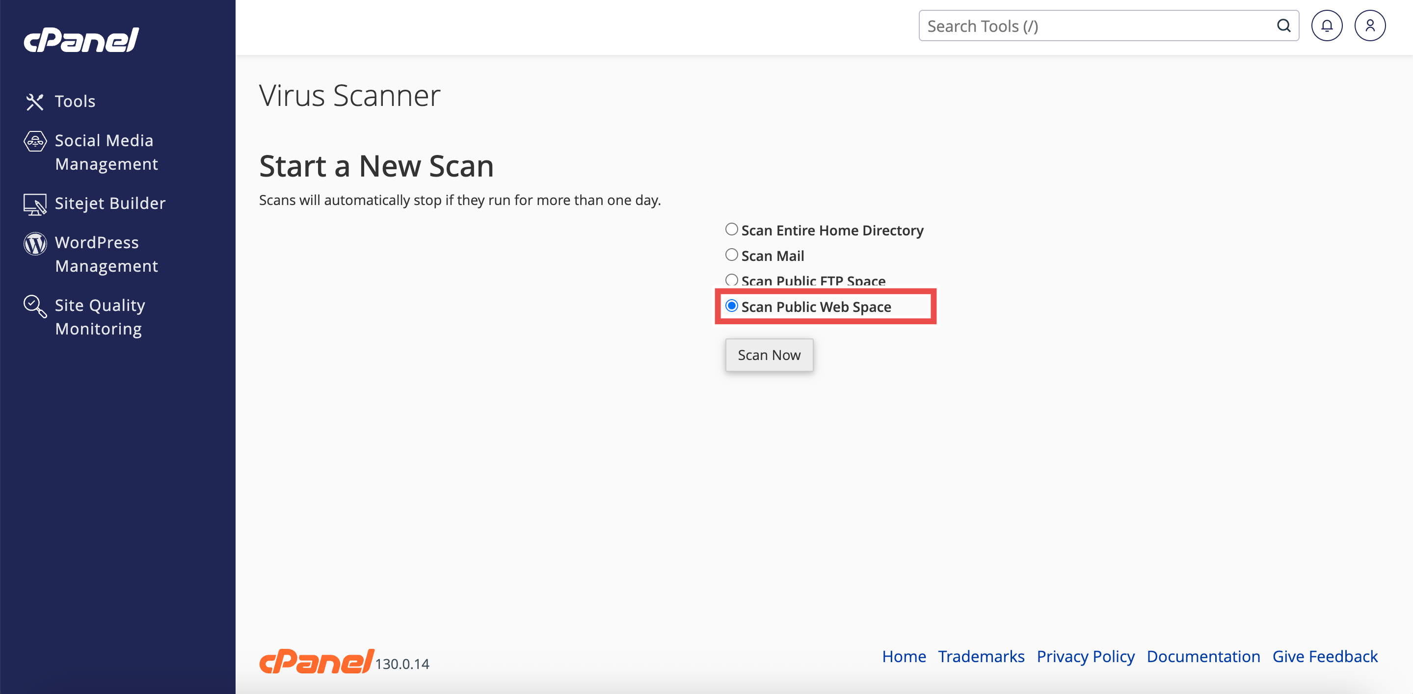 • In the Virus Scanner interface, choose Scan Public Web Space to check all files in your website’s root directory.
