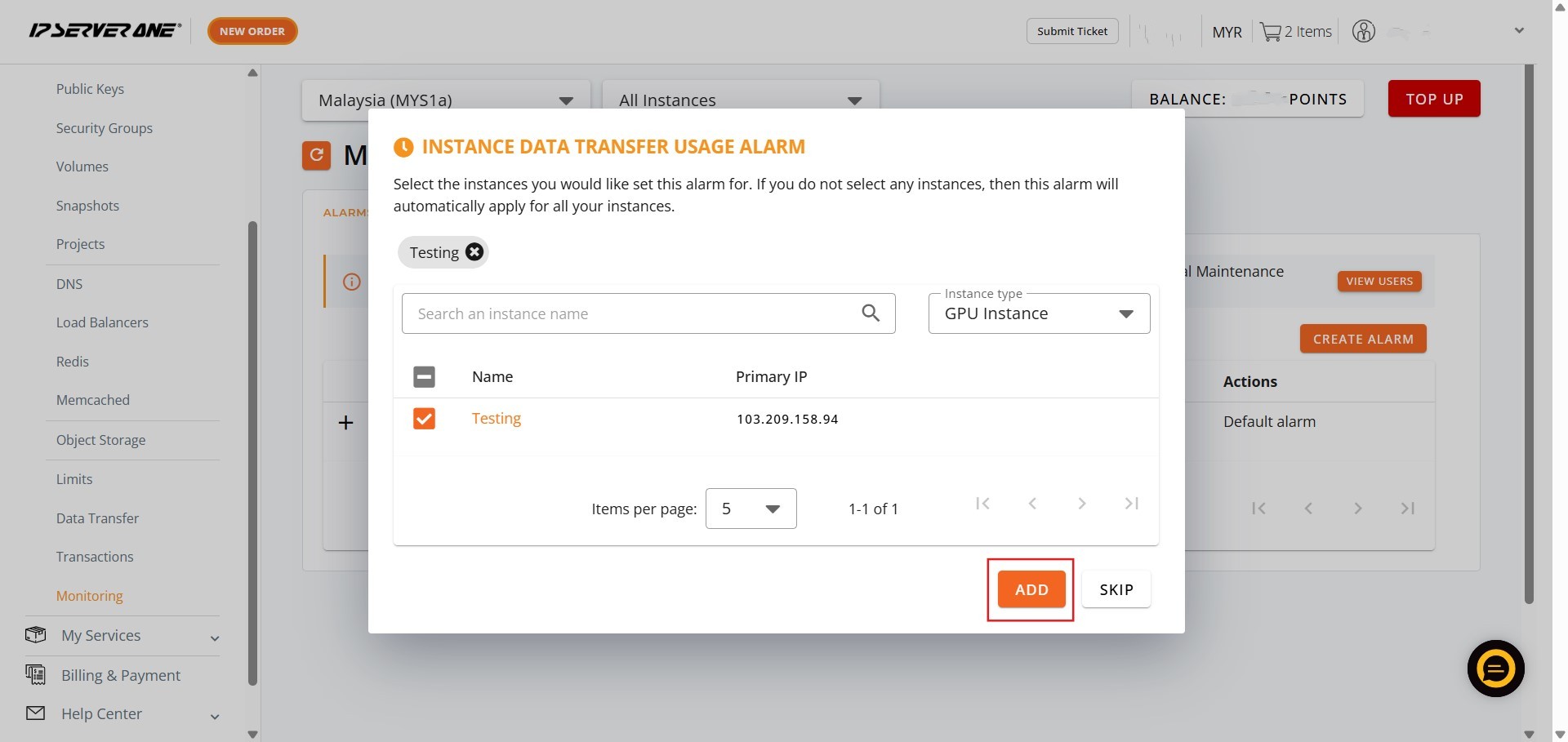 • Choose the specific Cloud Instance(s) for which you want to monitor bandwidth usage, and click “Add” to associate them with the newly created alarm.